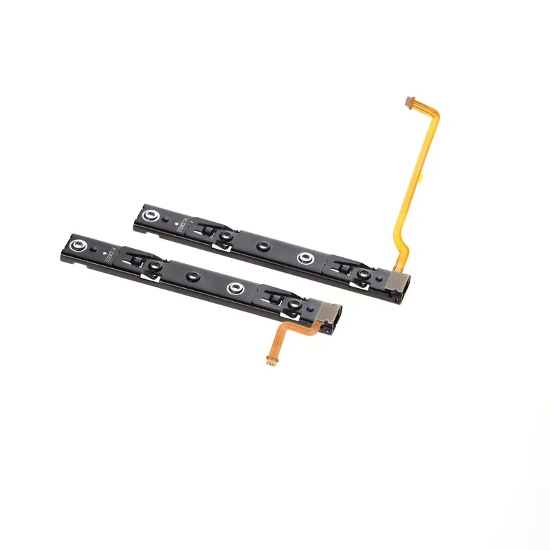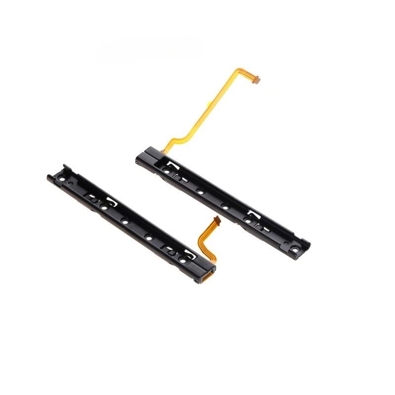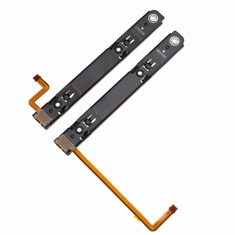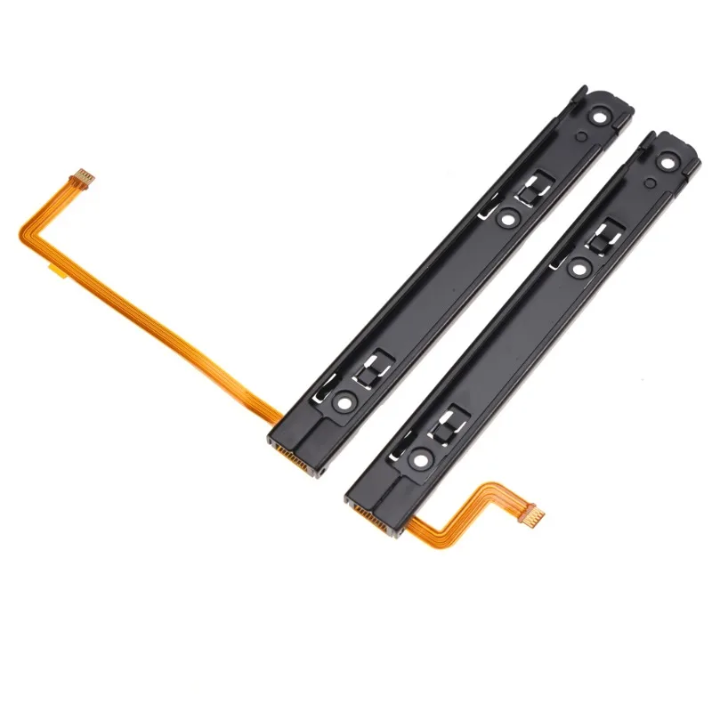 Enhance your Nintendo Switch repair with this set of black replacement right and left slide rails, compatible with OLED and standard models. Designed for the handle path sliding mechanism, these durable plastic rails feature mounting points with circular indentations and small connecting slots for seamless integration with sensor flex cables. The set includes flexible orange ribbons that connect to the console’s main board, ensuring stable operation. Marked with alphanumeric identification for easy recognition, these accessory kits are ideal for rebuilds, offering a streamlined, functional design that restores your Switch’s sliding mechanism with precision and reliability.
