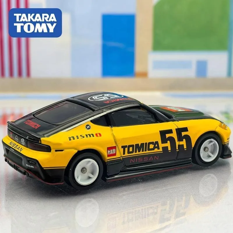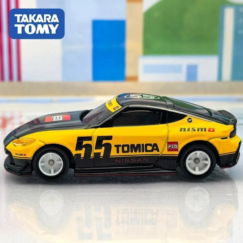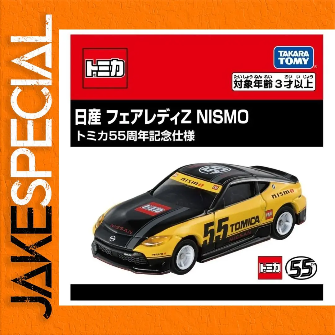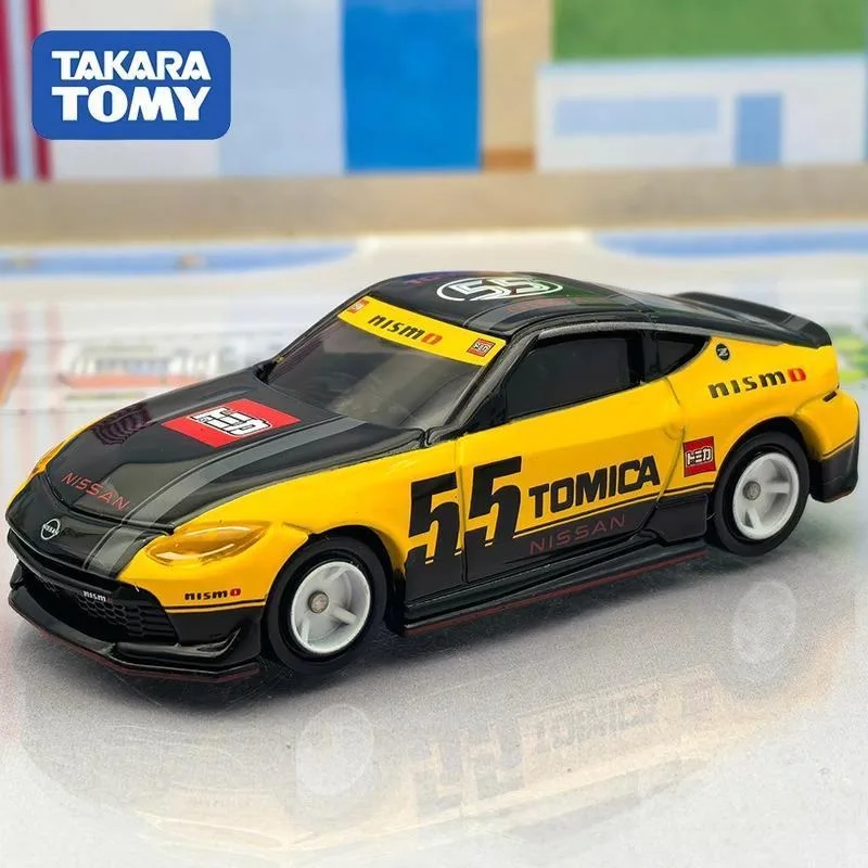 This stunning diecast alloy model car celebrates the 55th anniversary of TOMICA with its striking Nissan Fairlady Z NISMO design. Its vibrant yellow body is complemented by bold black accents, including a sleek black hood and front bumper showcasing the silver Nissan logo. The sporty aspect is highlighted by a prominent black stripe running from the front to the back, with “NISMO” branding in white letters. The car features meticulously crafted details, like the prominent “55” on one side and clean white wheels with visible rims, adding to its aesthetic appeal. It's a must-have collectible for enthusiasts, capturing the essence of the iconic sports car.