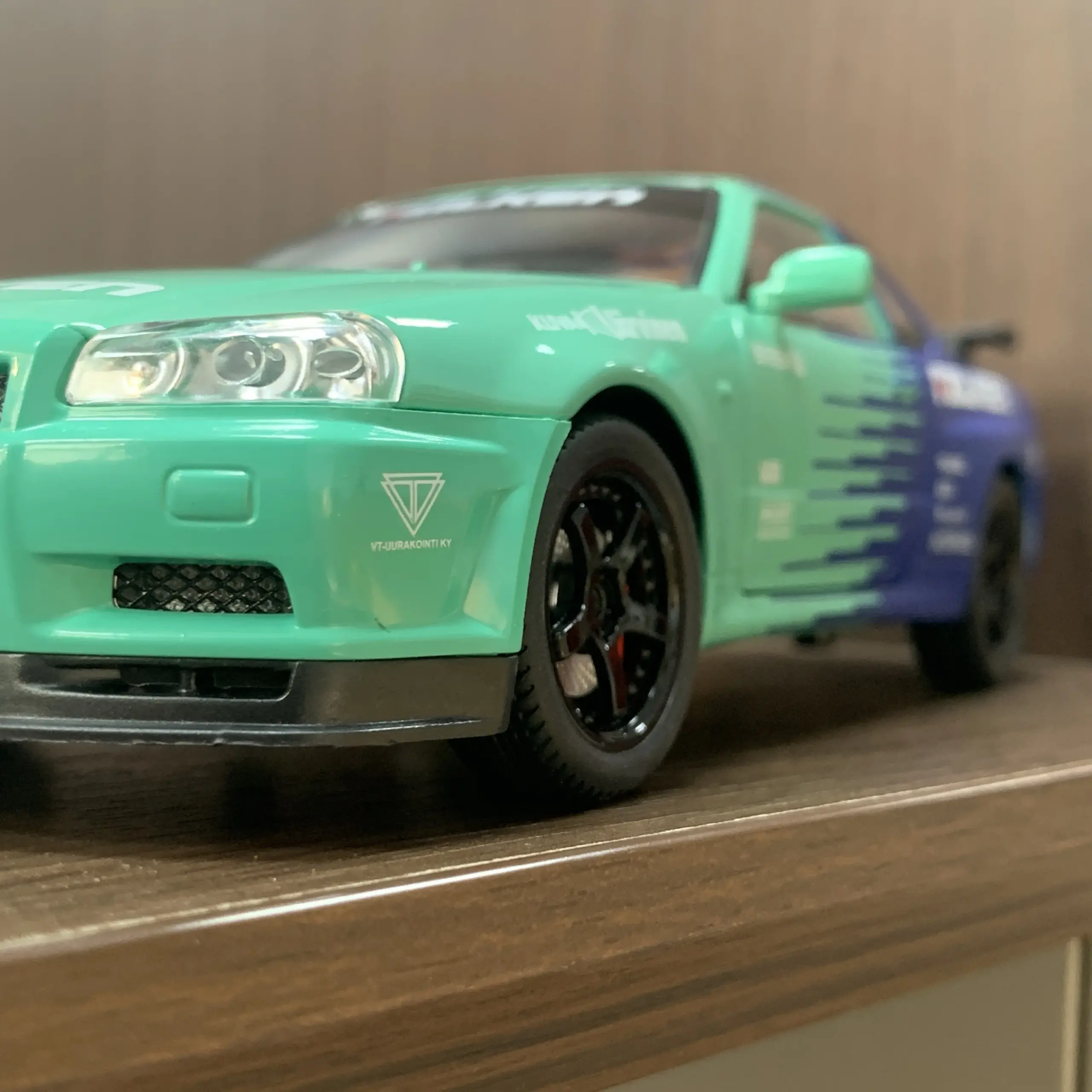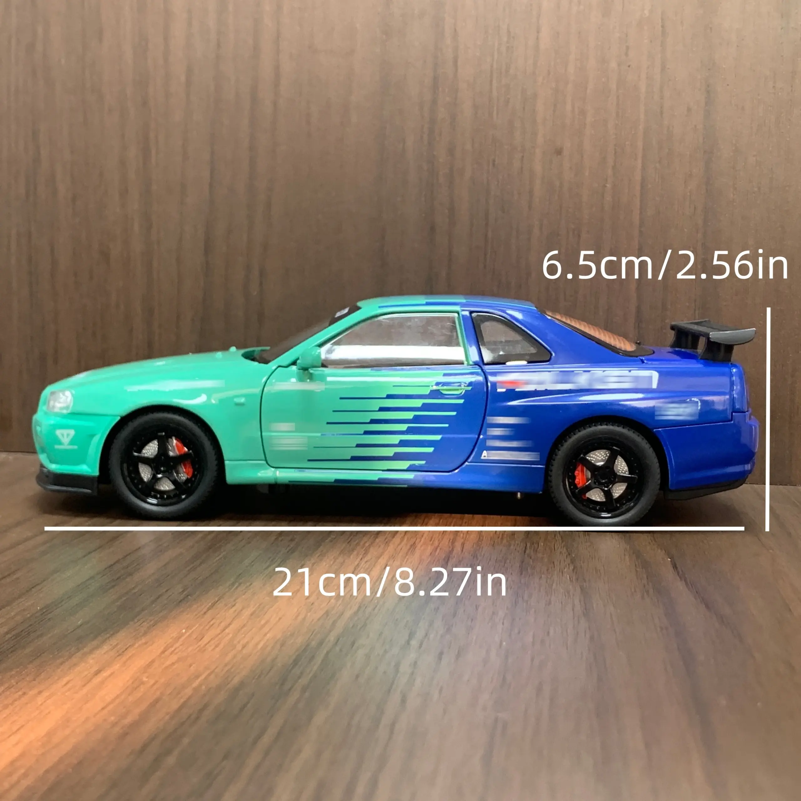 Experience the thrill of owning a meticulously crafted Nissan GT-R with this 1/22 scale die-cast alloy model. Its vibrant, glossy blue finish captures the sleek, aerodynamic design of the original, reflecting light with a shiny, metallic surface that enhances realism. The detailed body features subtle lines and indentations, replicating authentic aerodynamics. The black wheels with intricate rims provide a sporty contrast, while the circular tail lights add a distinctive touch. The rear spoiler, in matte black, protrudes slightly upward, emphasizing its performance-oriented look. Decorative decals in blue and white further evoke a racing spirit. Perfect for collectors or enthusiasts, this model brings dynamic style and craftsmanship into your space as an eye-catching retro ornament.