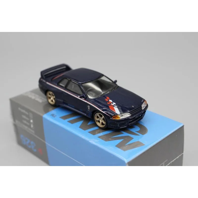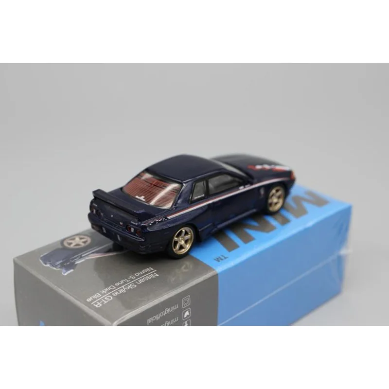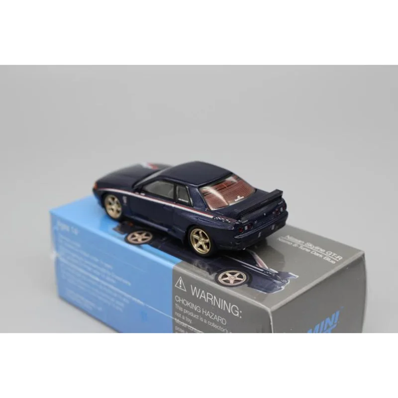 Experience the thrill of owning a detailed replica of the iconic Nissan GT-R Skyline R32 Nismo with this meticulously crafted 1:64 scale model. Designed for enthusiasts and collectors alike, this miniature captures the sleek, aerodynamic silhouette and sporty elegance of the original vehicle. Its glossy deep navy blue finish is accented with bold red and white graphic livery, enhancing its dynamic appeal. The model features realistic headlights, taillights, side mirrors, and a rear spoiler that mimics the racing version, providing an authentic look. The gold-toned rims and transparent windows revealing a detailed interior further add to its visual richness. Perfect for display, gifting, or home decoration, this collectible transports you closer to the legendary R32 Nismo.