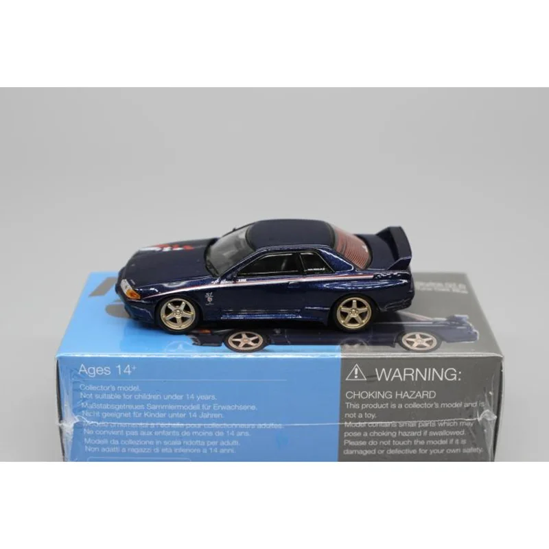 - Technical specifications include a zinc alloy body, plastic accents, rubber tires, 1:64 scale, non-electronic, safety compliant for ages 14+, and ideal for collectors seeking an authentic miniature representation of the classic R32 Nismo.