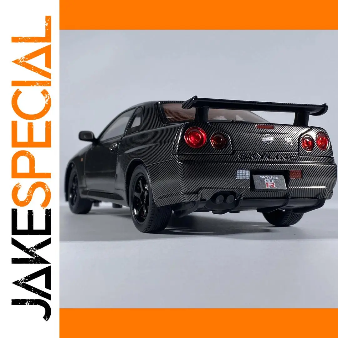 - This 1:24 scale diecast model boasts a sleek black finish with textured carbon fiber details, emphasizing its sporty and aggressive style, closely resembling the real GTR R34 Skyline for collectors and enthusiasts.