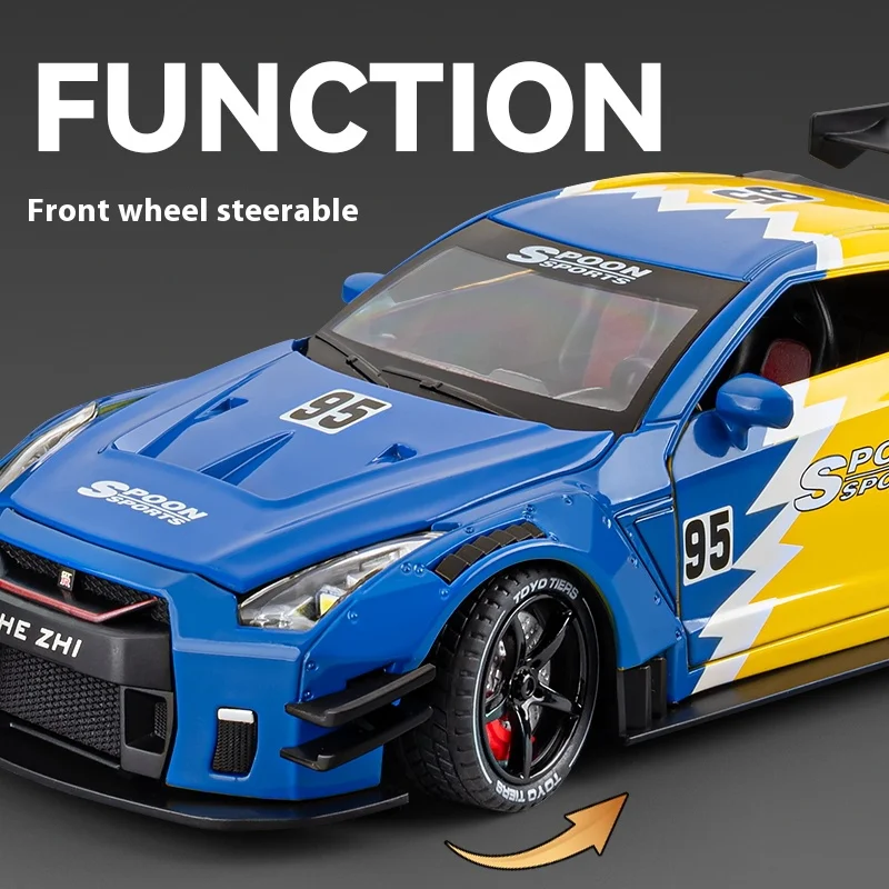 Enhance your collection with this highly detailed 1:24 scale diecast model of the Nissan GTR Track Edition alloy car, crafted from metal for durability and realism. Available in striking black with a box or vibrant blue with a box, this model features a sporty aerodynamic design, including a large rear wing spoiler, black multi-spoke wheels with treaded tires, subtle panel lines, vents, and a black carbon fiber roof that exudes a high-performance aesthetic. Suitable for ages 14 and above, it offers a perfect blend of precision and detail, making it an ideal piece for automotive enthusiasts and collectors seeking a race-inspired, visually stunning display.