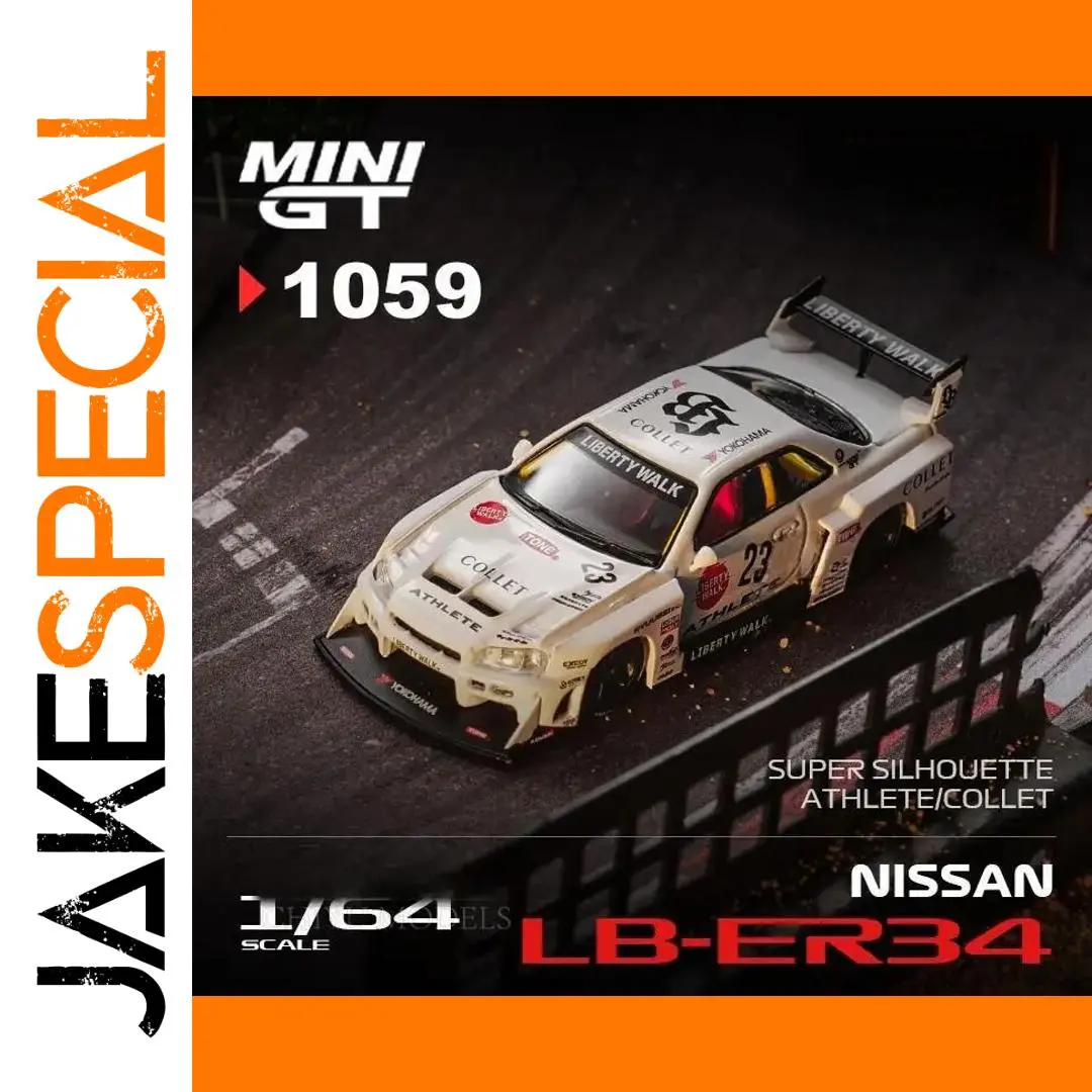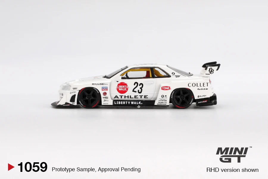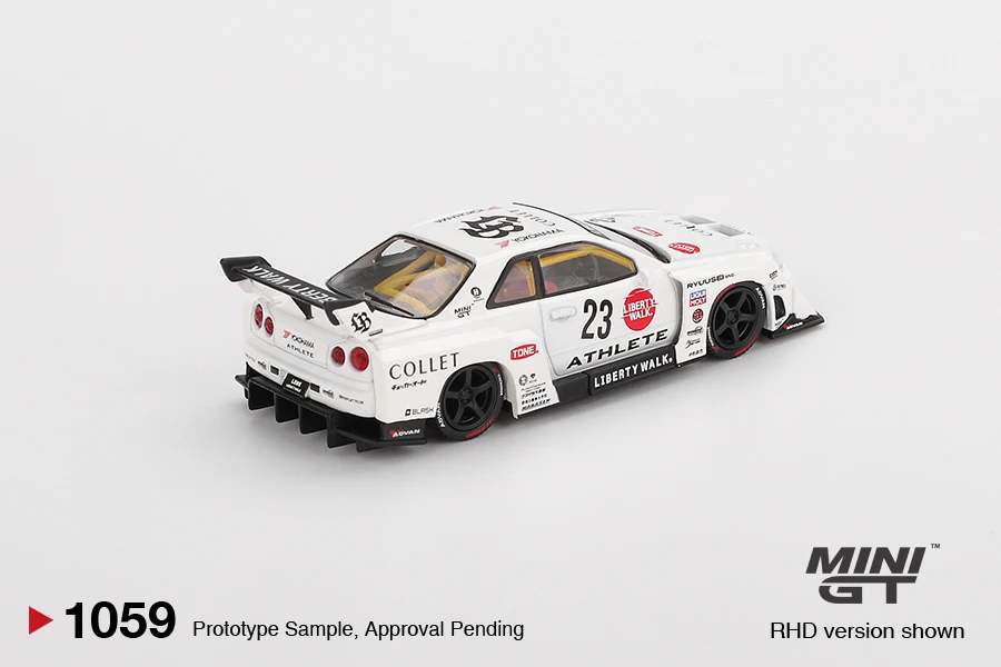 The 1:64 scale diecast metal model of the Nissan LB-ER34 Super Silhouette ATHLETE/COLLET offers a highly detailed and realistic racing-inspired design, finished in a sleek white with a patriotic ‘1059’ color code. Its aerodynamic body features a wide body kit, prominent front splitter, and large rear wing spoiler marked with “LIBERTY WALK,” capturing its high-performance aesthetic. The realistic details include detailed headlights, tinted windows revealing a racing interior, aerodynamic vents, and meticulously crafted wheels and brake components. Built for collectors and enthusiasts, this model is suitable for display and combines durability with exceptional craftsmanship, making it an ideal addition to any race car collection.