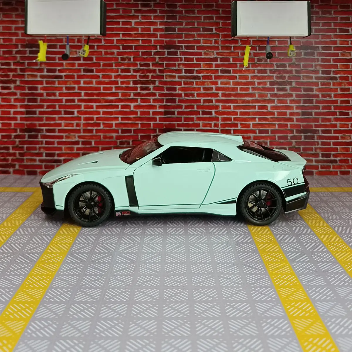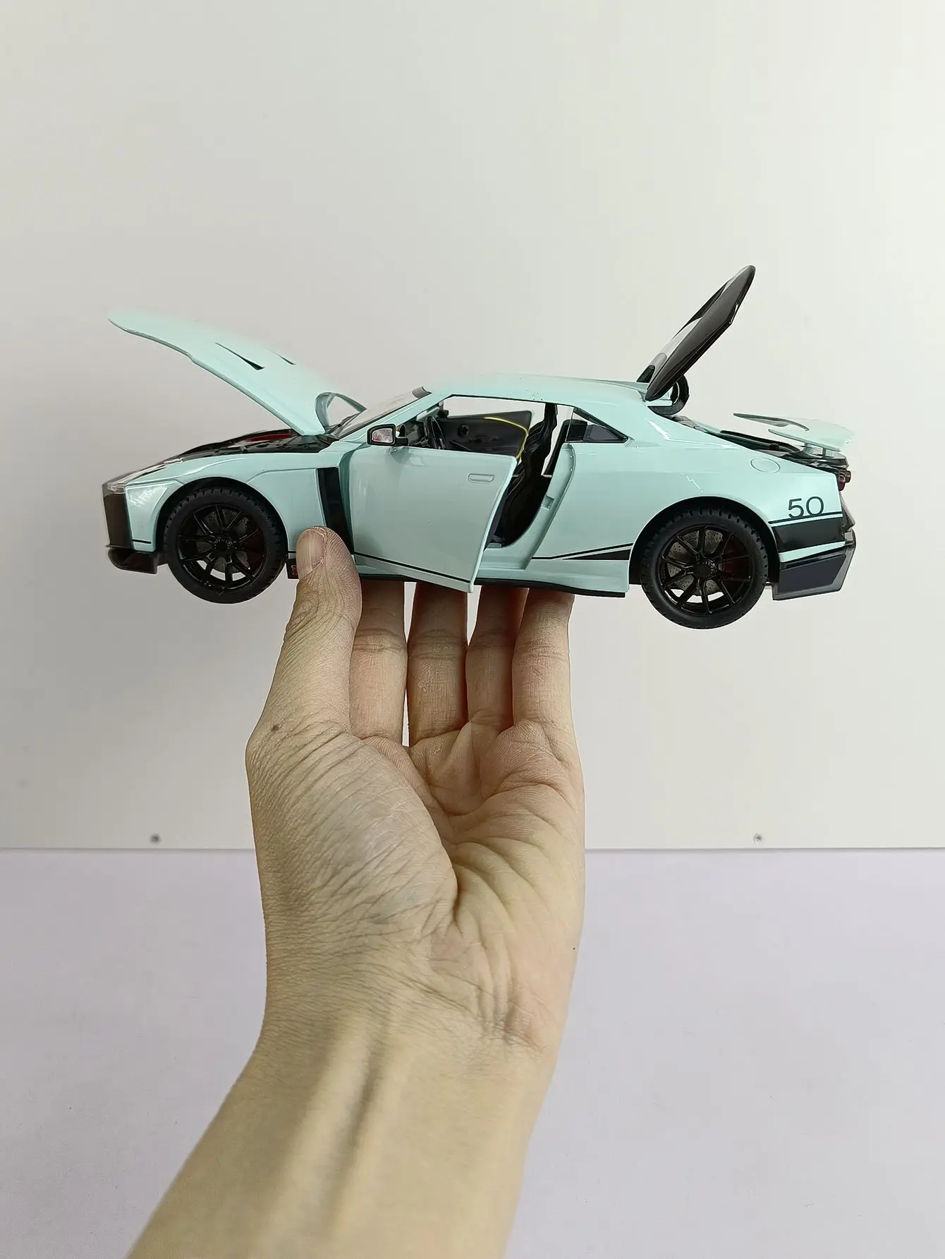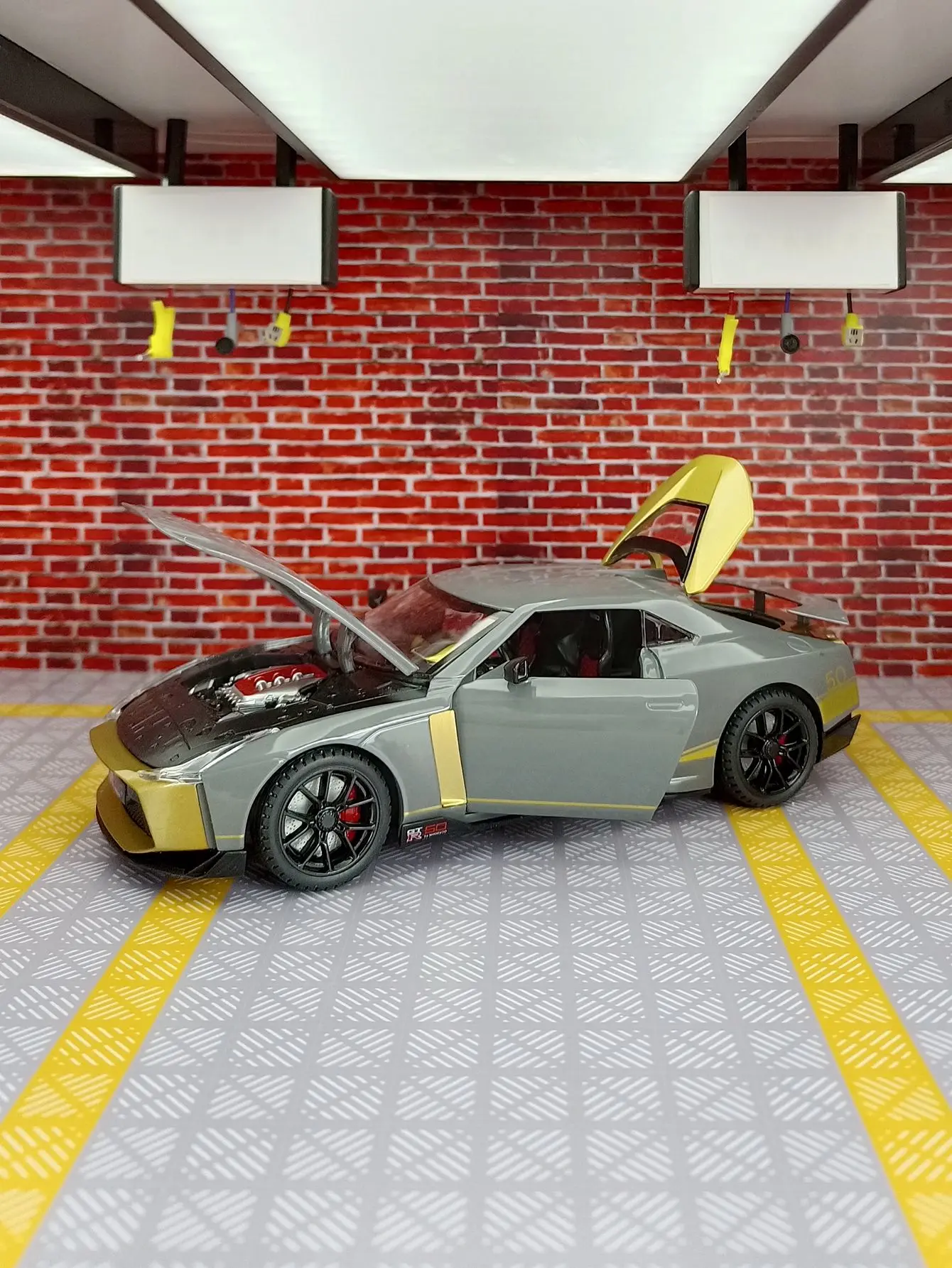 Experience the thrill of high-performance automotive design with this 1:24 scale diecast model car of the Nissan Skyline Ares GTR50 GT-R50. Finished in a sleek metallic gray, this model showcases sharp angular lines and a prominent front grille, while yellow accents provide visual contrast along the sides. The model features black multi-spoke wheels with striking red highlights, and its detailed interior reveals racing-inspired elements. Sound and light capabilities enhance the realism, operating via a button battery. Crafted from durable metal, this model is perfect for collectors and automotive enthusiasts alike. Available in gray, green, and red.