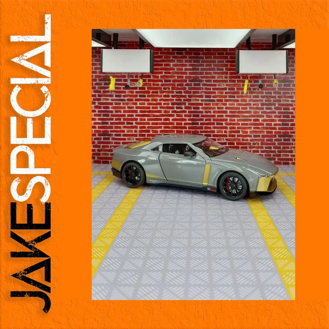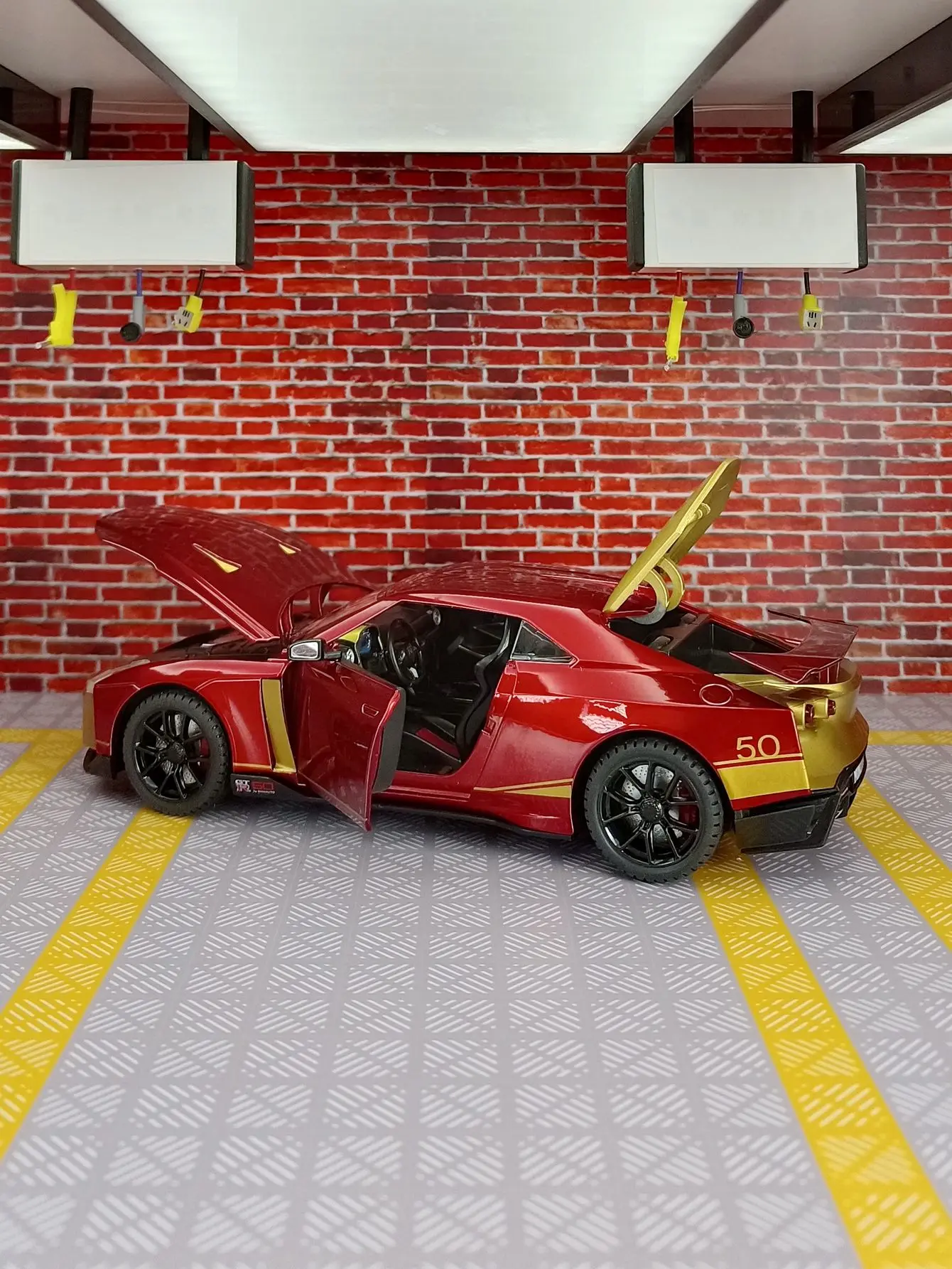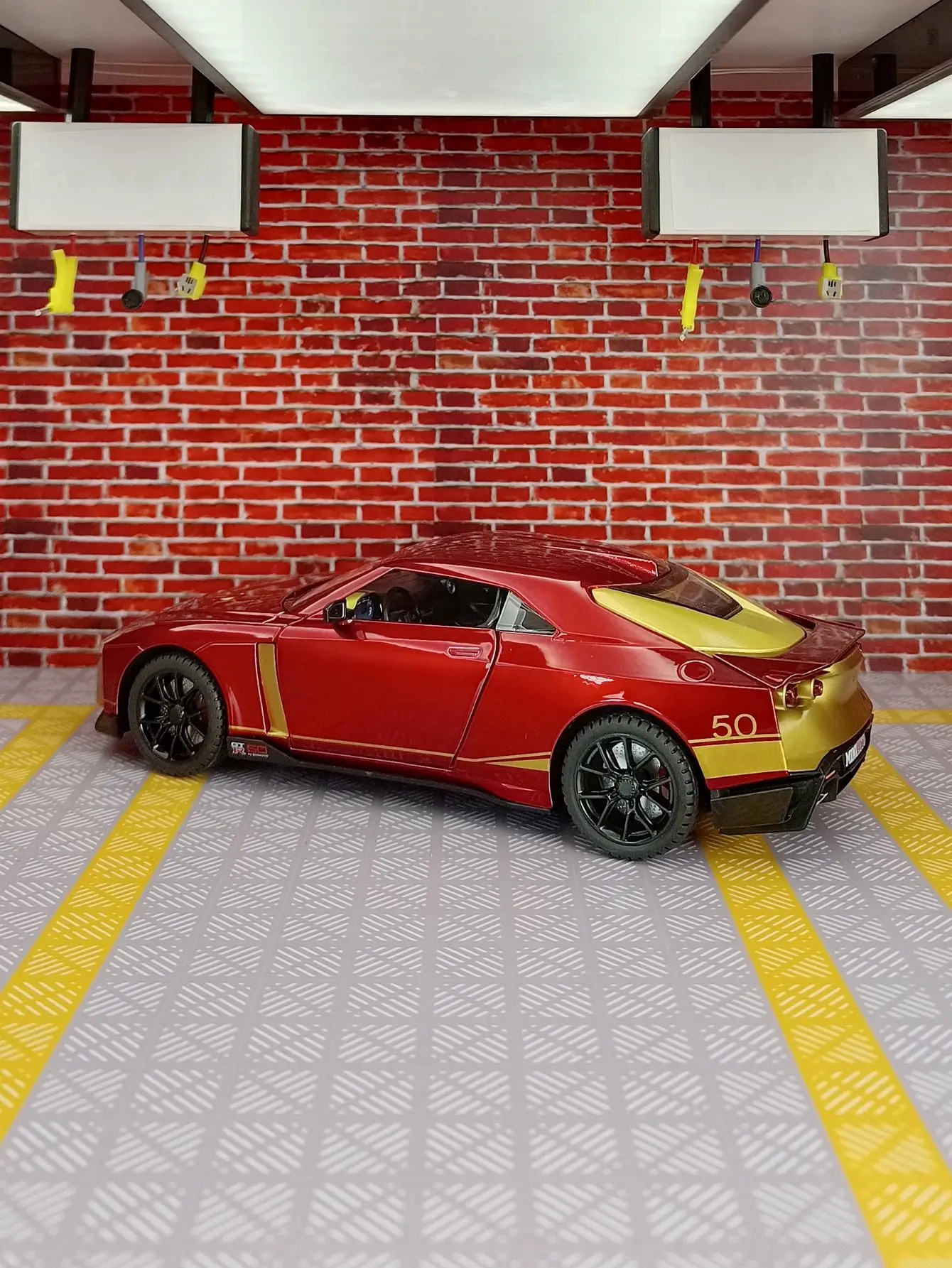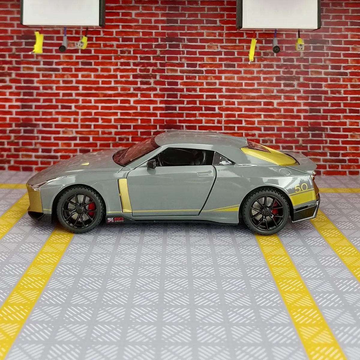 Experience the thrill of high-performance automotive design with this 1:24 scale diecast model car of the Nissan Skyline Ares GTR50 GT-R50. Finished in a sleek metallic gray, this model showcases sharp angular lines and a prominent front grille, while yellow accents provide visual contrast along the sides. The model features black multi-spoke wheels with striking red highlights, and its detailed interior reveals racing-inspired elements. Sound and light capabilities enhance the realism, operating via a button battery. Crafted from durable metal, this model is perfect for collectors and automotive enthusiasts alike. Available in gray, green, and red.