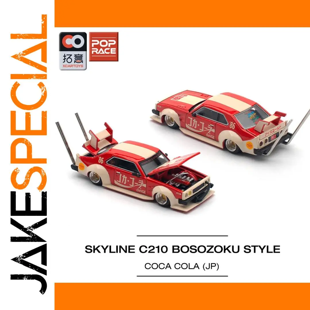 Experience the allure of this meticulously crafted Nissan Skyline C210 die-cast alloy model, perfect for collectors and enthusiasts. Measuring about 7cm in length, this 1:64 scale masterpiece captures the bold, customized Bosozoku style with intricate details. Its vivid red paint contrasted by cream or beige accents highlights the sporty, vintage aesthetic. The model features a lofted rear wing spoiler, detailed engine bay with open hood, and authentic decals including Japanese characters and retro branding like Coca-Cola. Black-tinted windows, gold rims, and low-slung bodywork further emphasize its high-performance street racing vibe. Each piece is a testament to craftsmanship, making it an eye-catching display item for passionate collectors.