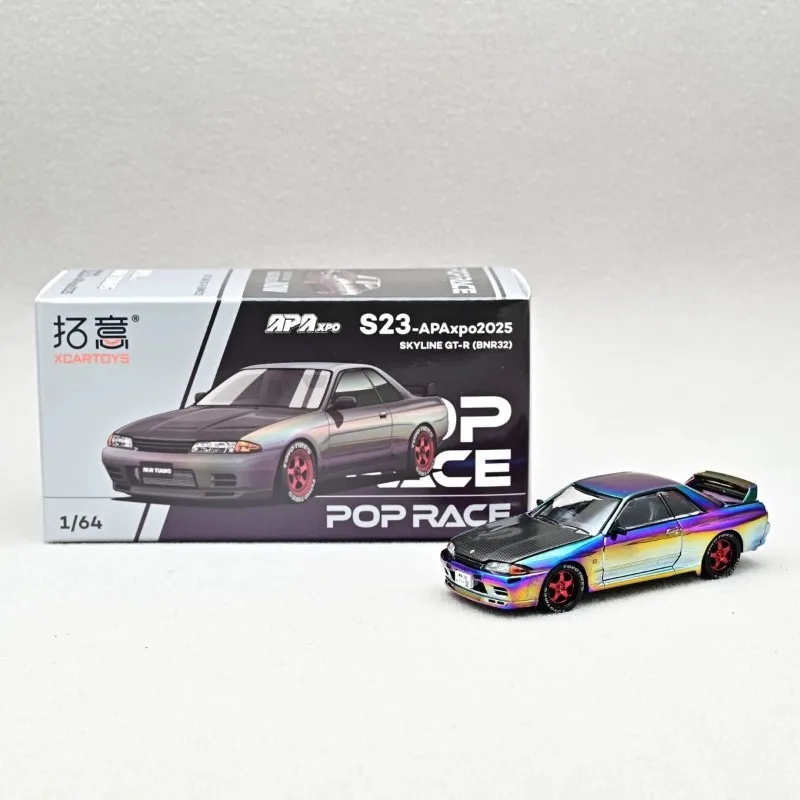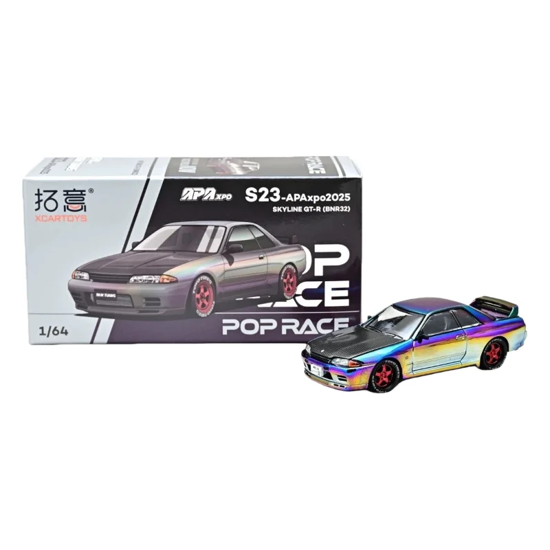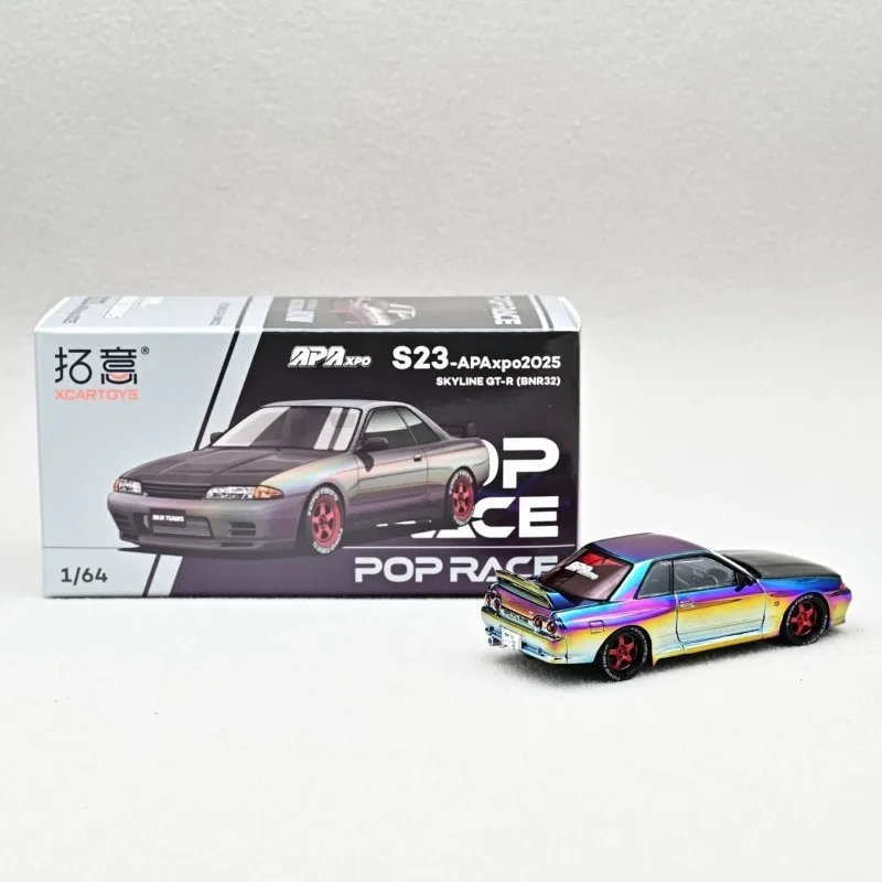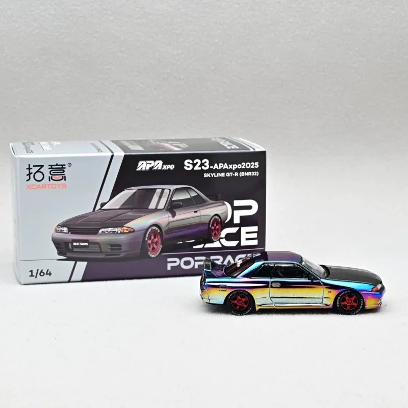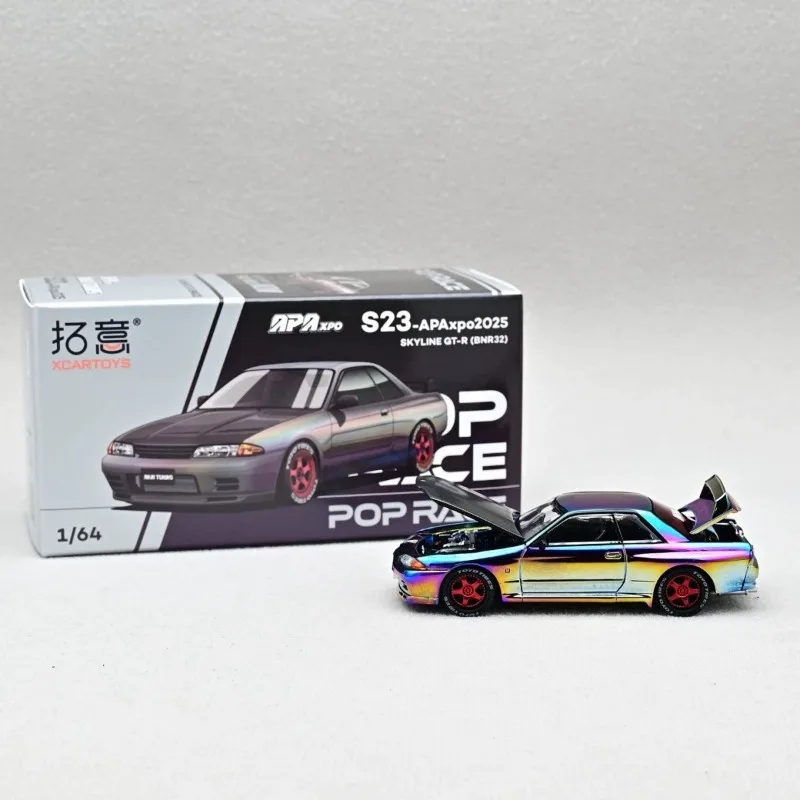Experience the striking realism of this 1:64 scale diecast model car, crafted from durable metal with a vivid, iridescent finish that shifts colors across hues of purple, gold, blue, and green. Designed to accurately replicate the iconic Nissan Skyline GT-R R32, the model features aerodynamically detailed lines, a shiny black rear spoiler, bright red five-spoke wheels with defined treads, and transparent windows revealing a simplified interior. The front and rear sections showcase realistic design elements, including air intakes and articulated trunk and hood with detailed engine and trunk interiors. Perfect for display or collection, this high-quality diecast model appeals to enthusiasts aged 14 and above.