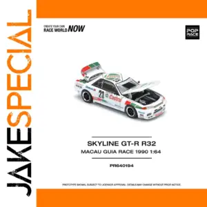 Immerse yourself in the racing heritage of the Nissan Skyline GTR R32 with this meticulously crafted diecast model. Scaled at 1:64, it captures the essence of the iconic car from the Macau Guia Race 1990. The body features a sleek, predominantly white color adorned with bold red and green racing livery, making it a standout piece for any collection. The open hood reveals intricate black mechanical details, showcasing the realistic engineering that enthusiasts appreciate. The model’s black wheels with silver rims and aerodynamic rear wing emphasize its sporty, aggressive stance. Designed for mature collectors, this lightweight metal reproduction reinforces authenticity through detailed decals and sponsor logos like Castrol, Reebok, and Dunlop. Perfect for display or as a treasured collectible.