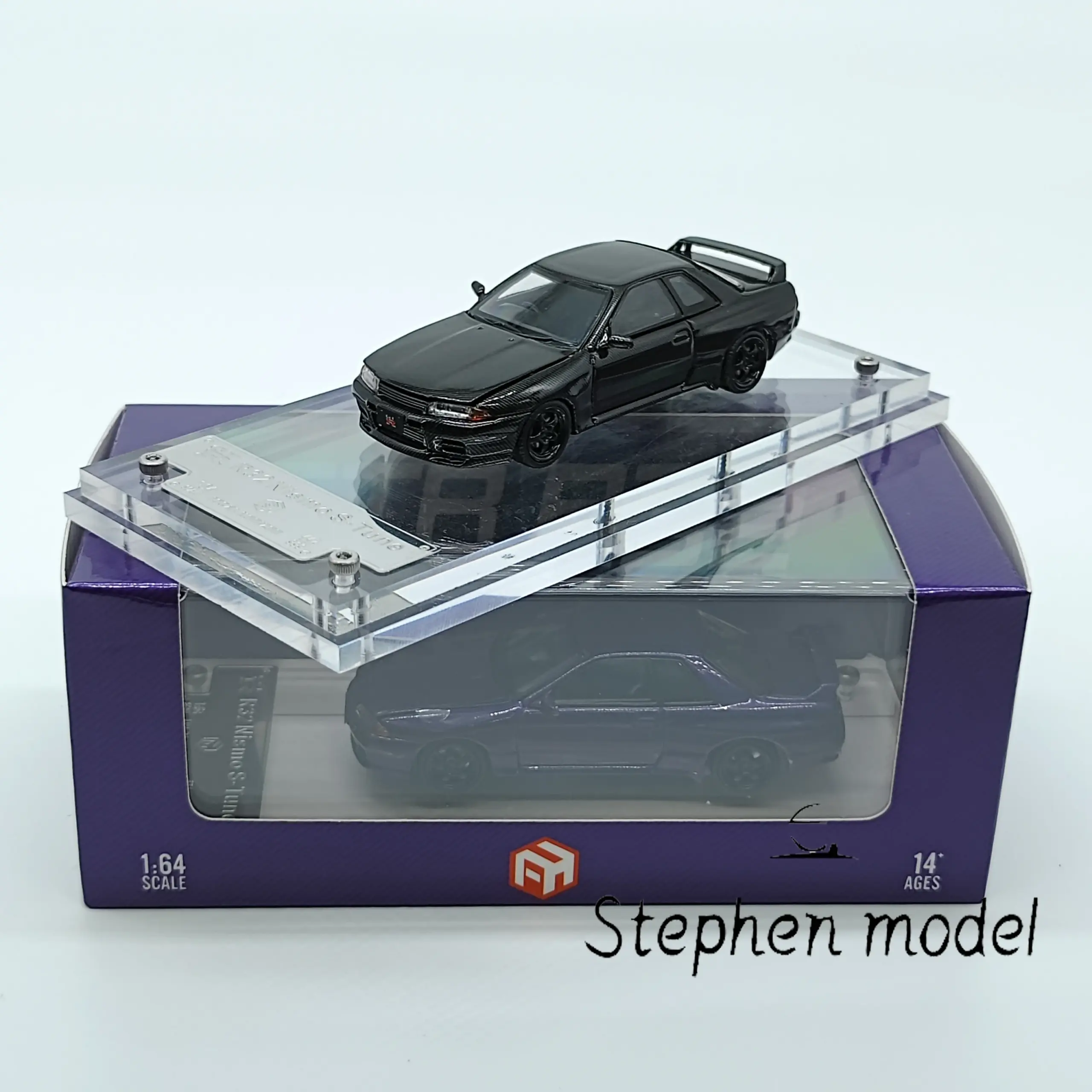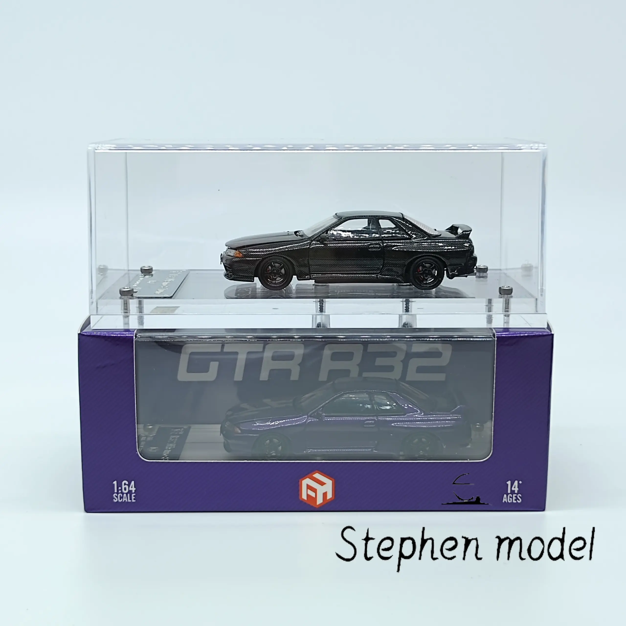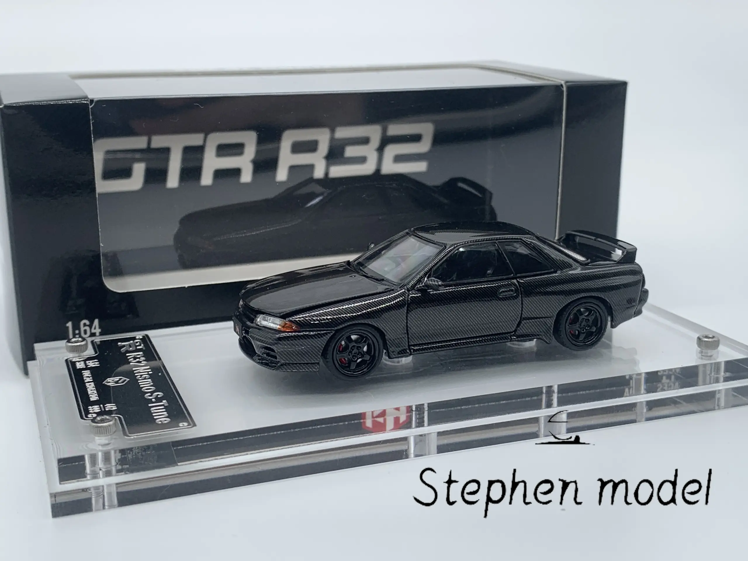 Discover the exceptional craftsmanship of this Nissan Skyline GTR R32 Nismo diecast model, meticulously designed for car enthusiasts and collectors. Featuring a stunning full carbon fiber finish, the model captures the iconic sporty and aerodynamic silhouette with precision. The textured woven pattern on the glossy surface highlights the high-performance aesthetic, while the black body is perfectly complemented by bold red brake calipers visible through multi-spoke black wheels. This 1/64 scale miniature boasts realistic proportions and intricate detailing, including a rear spoiler and clear windows revealing a well-crafted interior. Ideal for display in your collection, it offers a captivating glimpse into automotive excellence, all protected by a sleek acrylic cover and sturdy packaging.