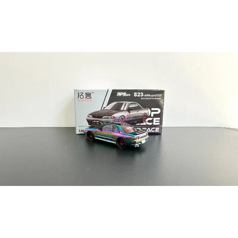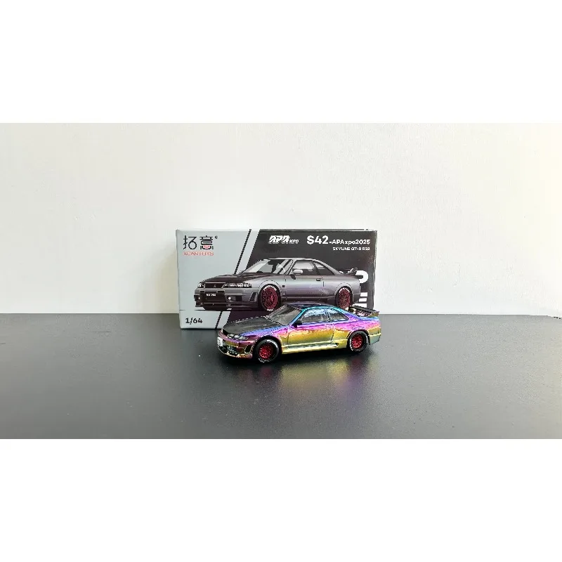Immerse yourself in the sleek elegance of this highly detailed model car, showcasing the iconic Nissan Skyline GTR R32/R33. Sized at approximately 7 cm, this 1:64 scale replica features a luminous iridescent rainbow finish that shifts colors from purple to blue, green, and gold, giving it a dynamic and captivating look under different light conditions. The alloy body offers a premium feel, accentuated by sculpted body lines and aerodynamic styling. Bright red alloy rims create a vibrant contrast, while the transparent windows reveal a meticulously crafted light-colored interior with detailed seats and dashboard. Perfect for collectors who appreciate realism and style, this model brings automotive artistry into your collection space with durability and finesse.