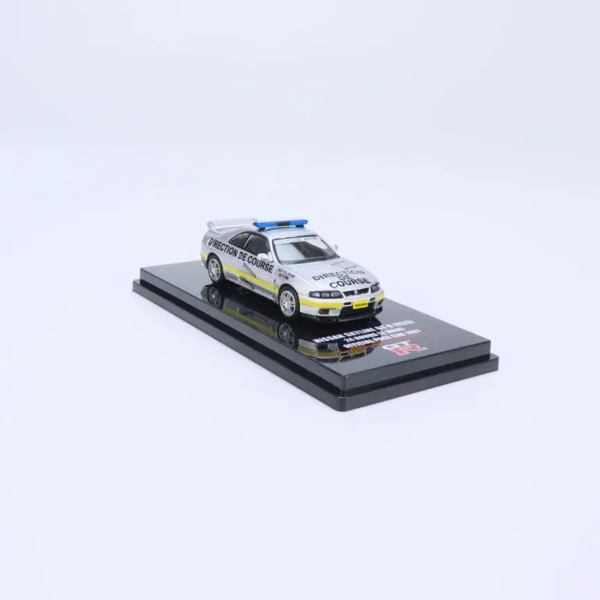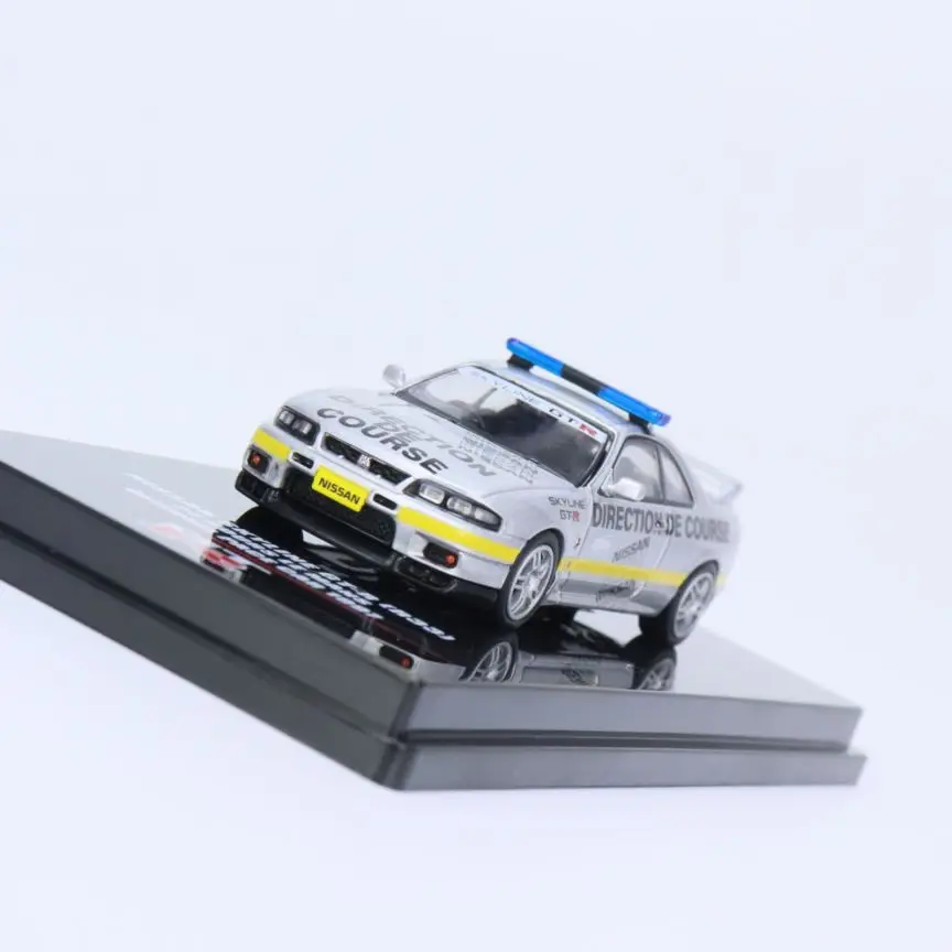 This detailed alloy die-cast model measures approximately 7 cm in length and is scaled at 1:64, depicting a Nissan Skyline GTR R33 police car finished in a sleek white with black accents. It features realistic decals, including racing and police markings, a detailed grille and headlights, sporty five-spoke silver wheels, subtly treaded tires, and a miniature blue police light bar on the roof. Crafted from metal and suitable for ages 14 and above, this meticulously designed collectible makes an attractive room ornament or gift for car enthusiasts and collectors. Certified to meet CE standards, it combines craftsmanship with authenticity, perfect for display and admiration.
