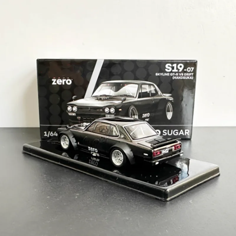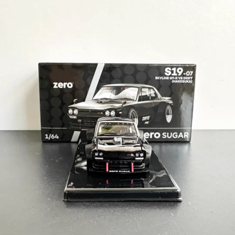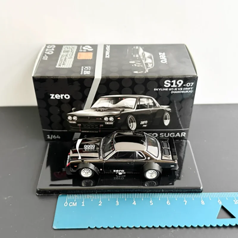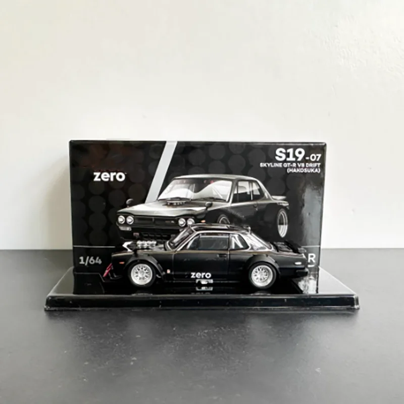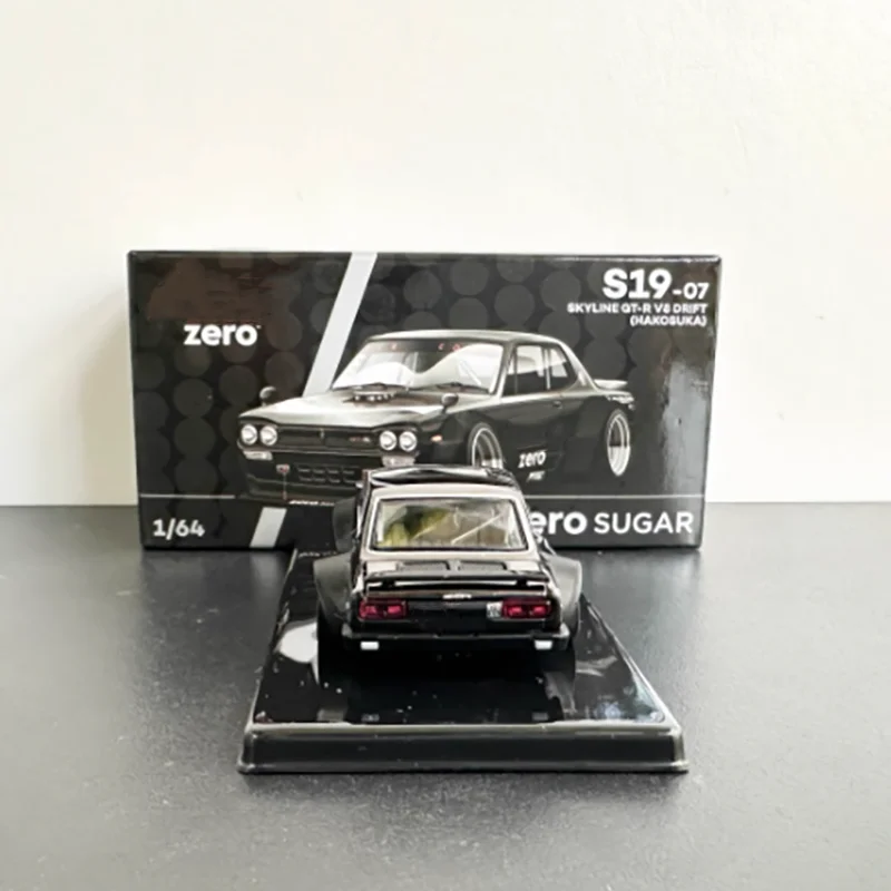 This meticulously crafted diecast Nissan Skyline GTR V8 model in 1:64 scale measures approximately 7.2 x 3.3 x 2 cm, made from alloy and plastic. It features a sleek black finish with detailed engine components, clear windows revealing intricate interior details, and stylized white rims on black tires. The front showcases four headlights, a detailed grille, and a sporty bumper with red accents and a subtle lip, embodying a realistic, premium aesthetic. Designed for display, gifting, and static decoration, this collector’s item is intended for enthusiasts aged 14 and above, offering a sophisticated addition to any collection.
