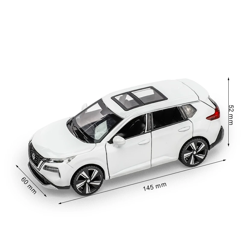 - Constructed from durable metal with a glossy white finish, accurately representing the sleek appearance of the real Nissan X-Trail SUV.