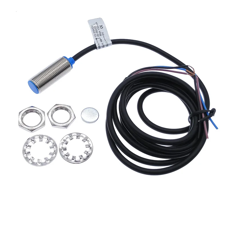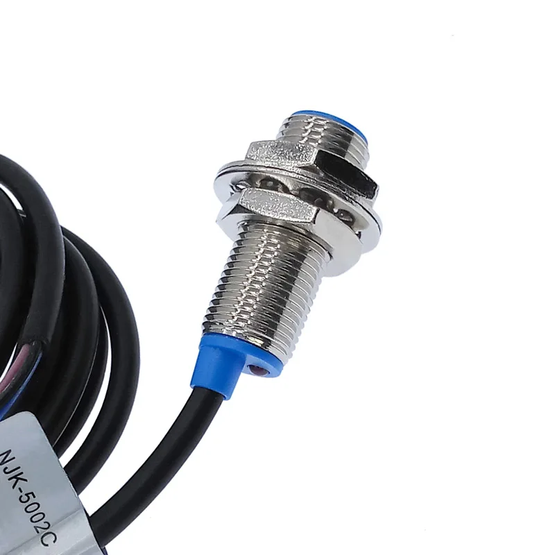 The NJK-5002C brass proximity switch features a sleek, cylindrical metallic body with a polished silver finish, complemented by a blue plastic sensing cap. It offers a detection distance of 10mm and operates within a voltage range of 6-36V. With an NPN 3-wire normally open output mode and a maximum output current of 200mA, this durable sensor is constructed from copper and brass for industrial reliability. Its compact design, including a threaded mounting section and a mounting bracket, ensures easy installation. Supported by a 1-year warranty, this non-smart proximity switch is ideal for precise detection in various industrial applications.