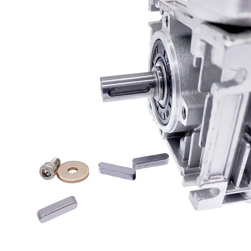 This high-precision NMRV worm gear reducer features a durable 14mm keyway shaft with model number RV030, available in both single and double output shaft configurations. Crafted from high-quality steel with stainless steel coatings, it boasts a surface roughness of Ra 0.05 for smooth, reliable operation. Its worm structure ensures efficient power transmission in industrial applications, offering a sleek, metallic appearance with a polished finish. Designed for durability and precision, this gear reducer seamlessly integrates into gear systems, providing dependable performance with a minimalist, modern aesthetic. Ideal for enhancing industrial machinery with a robust, corrosion-resistant component.