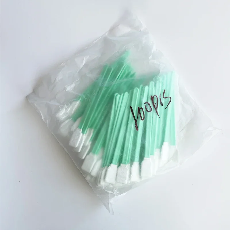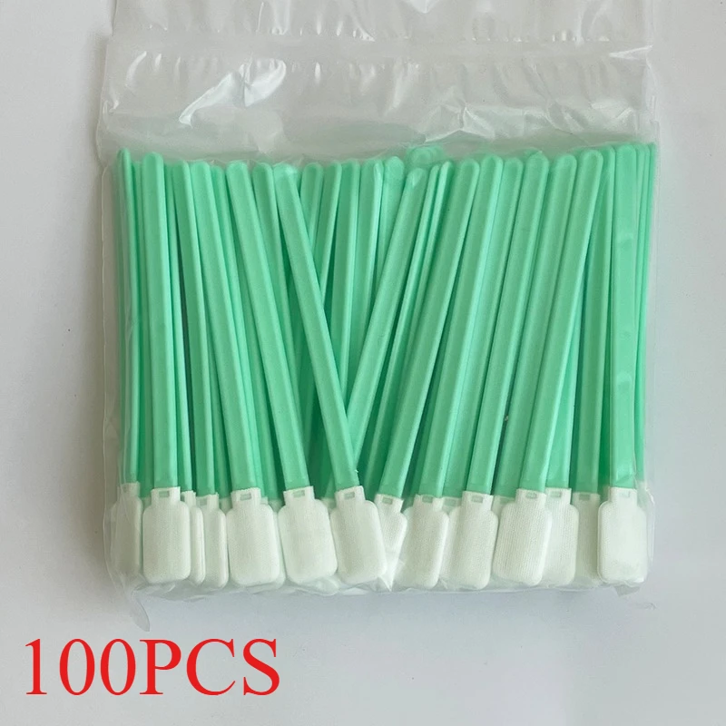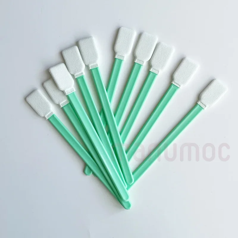 This set of non-woven cotton swab cleaning sponges features small, rectangular white tips with a textured, ribbed surface designed for precision cleaning of electronic devices, including Epson and Roland printers. Mounted on smooth green plastic handles, these 50 or 100-piece kits provide an effective, gentle solution for removing dust and residuals during phone repairs and device maintenance. The ergonomic handles ensure comfortable grip while the minimalistic, clean design offers optimal control. Made from safe, chemical-free materials, these versatile cleaning tools are perfect for technicians and enthusiasts seeking reliable, professional-grade cleaning accessories to maintain the performance and longevity of sensitive electronic components.