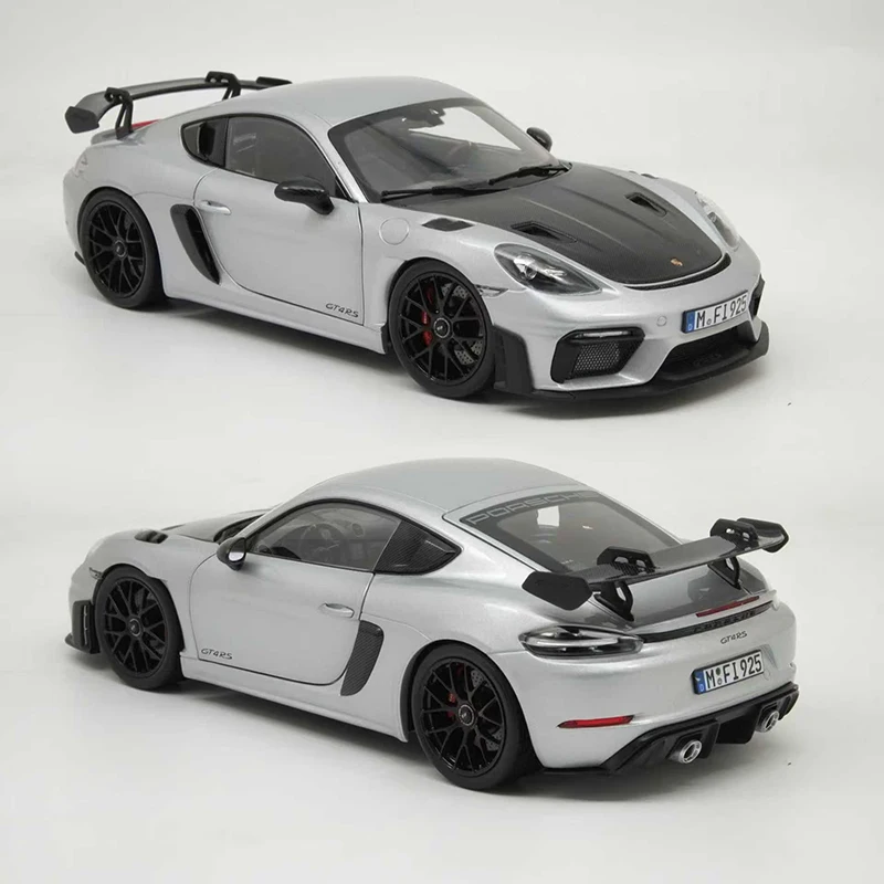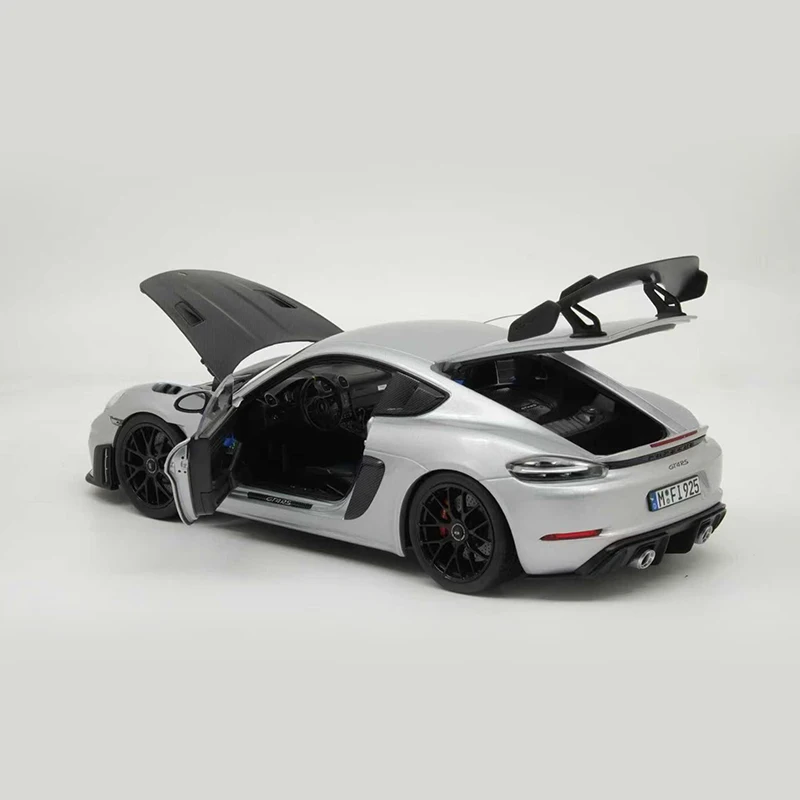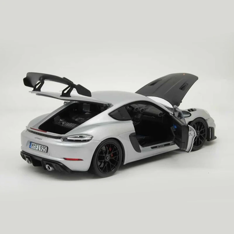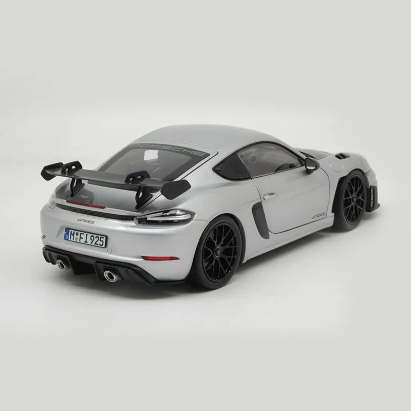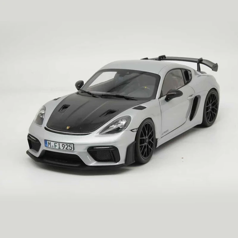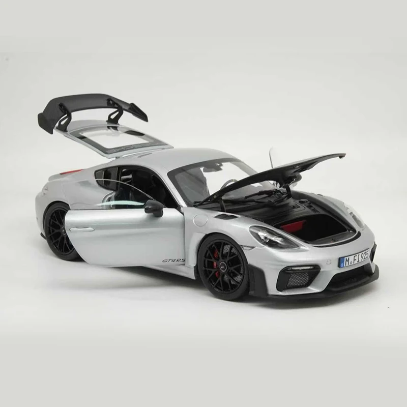 Experience the precision and realism of the NOREV 1/18 scale Porsche Cayman GT4 RS Weissach die-cast model, measuring approximately 25cm in length, 10.5cm in height, and 7.5cm in width. Crafted from high-quality metal and finished in a sleek GT4 Silver metallic paint, this static display captures the aerodynamic contours, detailed headlights, large black grille, vent accents, side mirrors, and the signature Weissach rear wing. Features include opening doors, sealed front and rear covers, steerable front wheels, and a linked steering wheel for added realism, making it a perfect addition for collectors seeking true-to-life detail in a stunning, performance-inspired miniature.