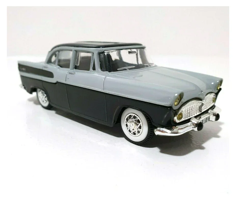 The N OREV 1:43 scale model of the 1958 Simca Chambord is a stunning representation of classic automotive elegance. Finished in a sleek gray complemented by a darker roof, this collectible piece showcases exquisite attention to detail. The intricate chrome grille and bumpers enhance its vintage charm, while the well-defined body lines reflect the classic design aesthetics of mid-20th-century automobiles. With its high-quality materials and smooth glossy paint, this model is not just a toy but a fitting tribute to automotive history. Display it proudly or add it to your growing collection, and let it transport you back to a time of stylish road trips.