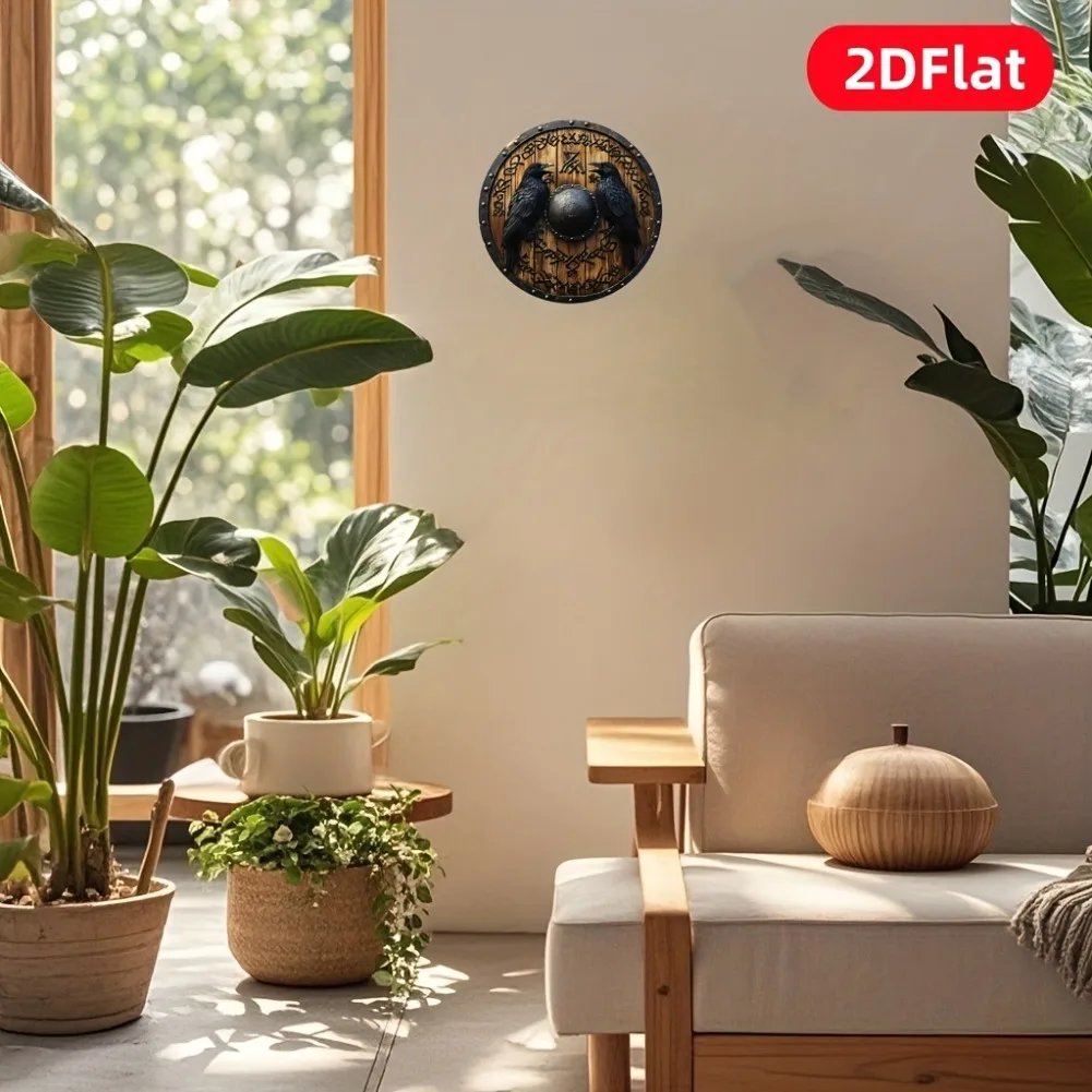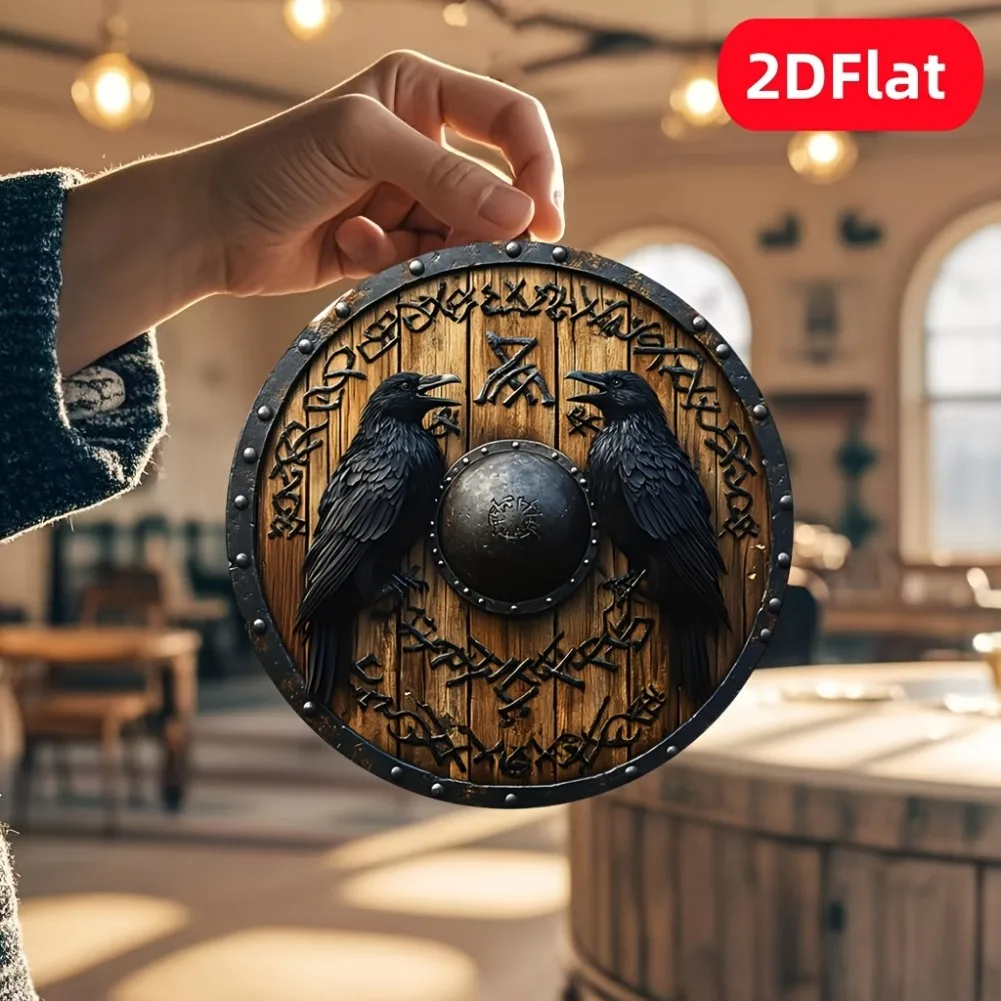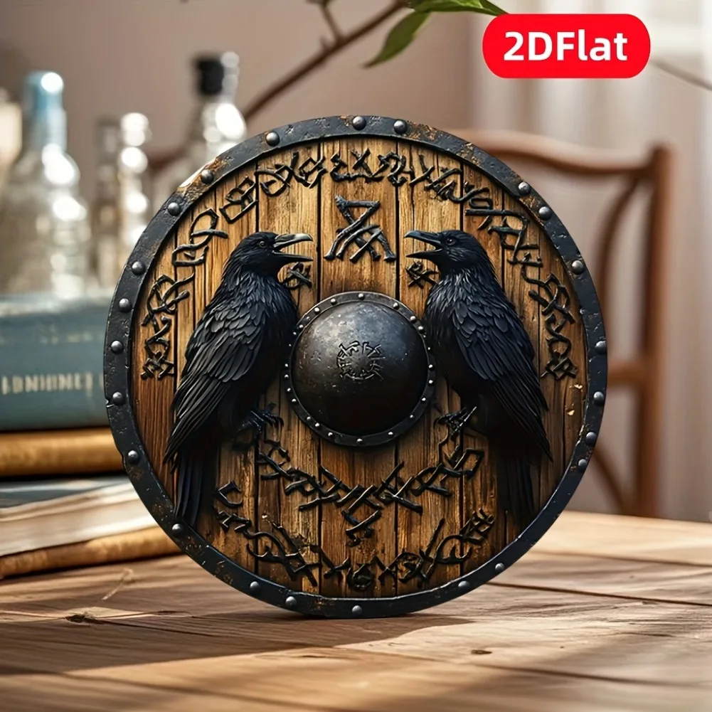 Transform your space with this 8-inch (20 cm) round artificial wood wall plaque featuring a vintage-inspired design adorned with Norse runes and a shield motif. Crafted from durable tin metal with a vibrant, colored finish (TYA32236), it offers a textured, layered appearance that captures attention. The plaque includes four pre-drilled holes, allowing versatile mounting options like nails or double-sided tape, making it perfect for indoor decor in homes, pubs, offices, shops, or garages. Its rustic, mythic aesthetic adds a unique touch to any environment—imagine it hanging proudly on your wall, showcasing its detailed black crows, metallic shield, and Norse symbols.