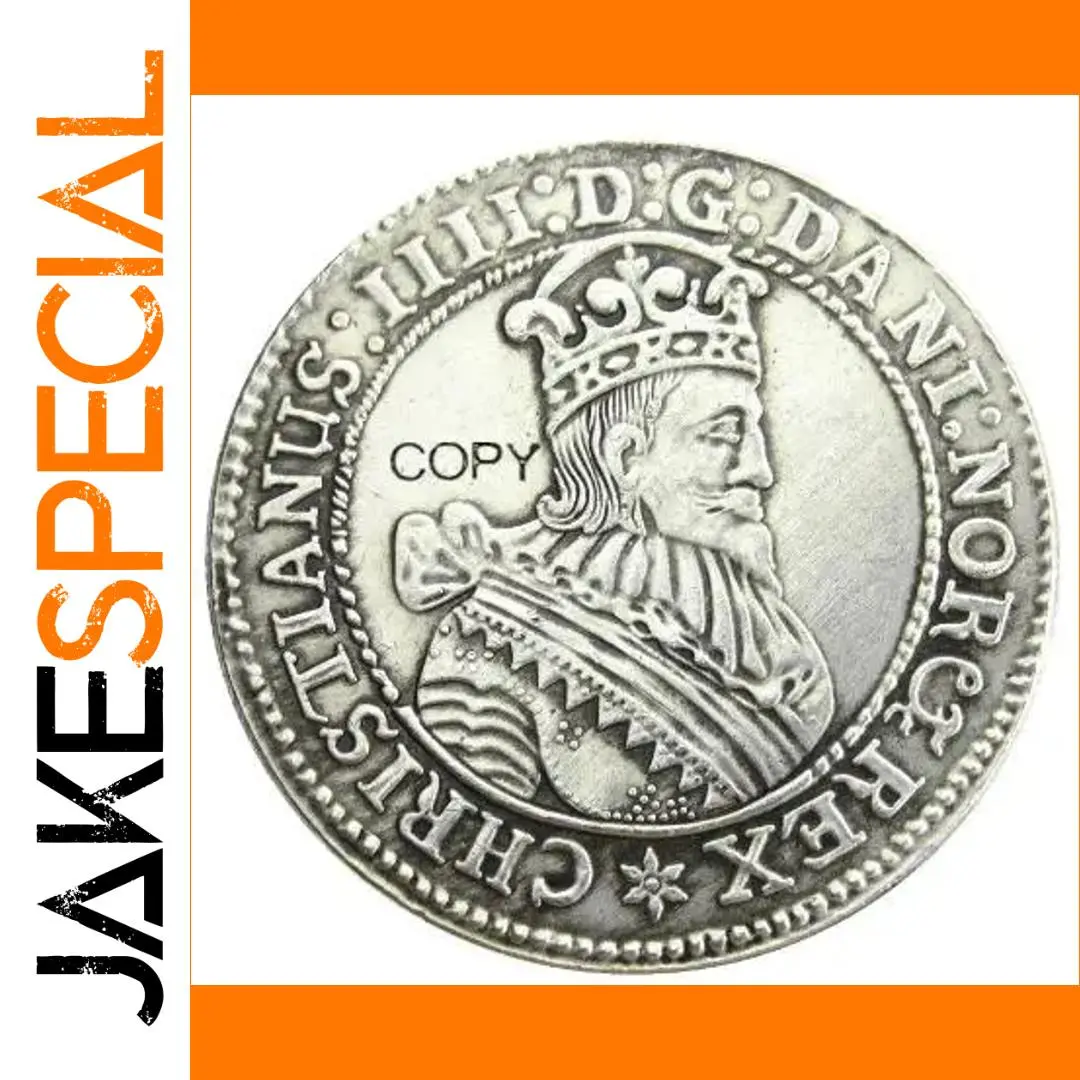 Experience the timeless elegance of this meticulously crafted replica of the Norway 1628 1 Speciedaler coin. Featuring a striking silver-toned metallic finish, this coin boasts a vintage, aged appearance that evokes nostalgia for historic treasures. Its detailed relief showcases a regal portrait of King Christian IV, adorned with an elaborate crown, long beard, and finely engraved facial features. Encircled by a prominent border inscribed with historical text and decorative symbols, the design exudes patriotic pride. The edge is adorned with a beaded pattern, adding to its old-world charm. Perfect for collectors or enthusiasts of historic memorabilia, this coin combines craftsmanship and cultural symbolism into a compelling piece that enhances any collection or vintage-themed decor.