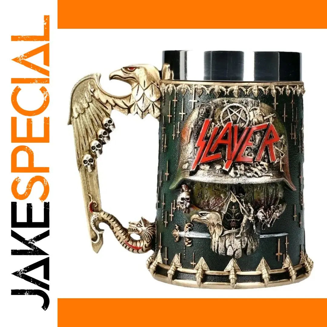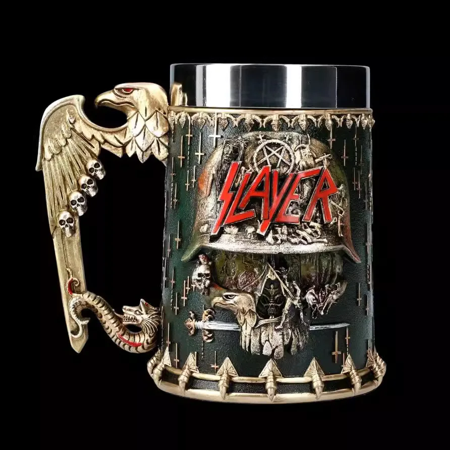 Immerse yourself in the dark, mythological world with this highly decorative beer mug inspired by Norse legends and heavy metal aesthetics. Crafted from fine polyresin with a stainless steel liner, this 600ml (20oz) vessel offers both durability and style. Its exterior features intricate hand-painted details, including bold red stylized lettering, mythic symbols, skull motifs, and dark fantasy scenes with skeletal figures and weapons, all finished with a metallic touch. The handle is shaped like an eagle’s head, with detailed feathers and a sharp beak, accentuated by skull embellishments and pointed spikes or thorns, adding an aggressive, fantasy-inspired aesthetic. The smooth rim provides a polished contrast to the ornate exterior, perfect for any collector or enthusiast of Norse mythology and fantasy décor.