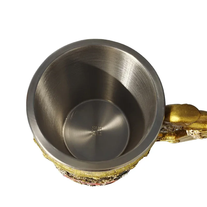 - This large 600ml mug is made of polyresin for detailed design, with a stainless steel liner, combining durability, style, and practical use for beverages.