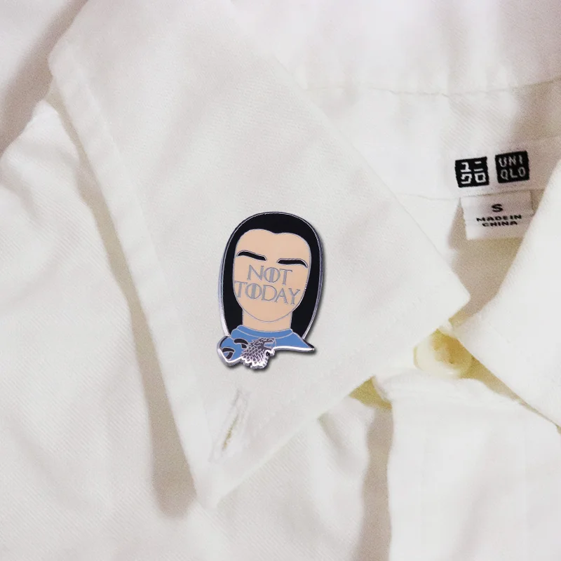 Celebrate your love for Game of Thrones with this sleek and modern enamel pin featuring Arya Stark from the iconic “Not Today” scene. Crafted with high-quality copper, this 30mm face-shaped brooch blends minimalist design with bold details. The cartoon-like representation highlights Arya's features through clean black outlines and neutral skin tones, emphasizing the powerful quote “NOT TODAY” in shiny metallic silver across the mouth. Below, subtle metallic outlines depict her clothing and Stark direwolf sigil, accented with blue and black enamel details for added depth. Its unisex, classic style makes it a versatile accessory that adds a touch of fandom to any outfit. Wear it proudly and keep your favorite scene close.