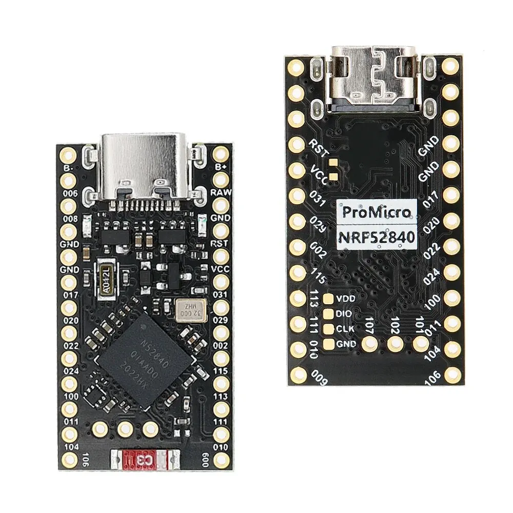 Experience seamless electronic development with this sleek, black NRF52840 Development Board designed for advanced connectivity projects. Its compact rectangular shape houses a dense layout of surface-mounted components, optimized for efficient performance. The board features a shiny silver micro USB port and a rectangular USB Type-C connector, providing versatile connection options. The prominent black square chip at the center, marked with minimalist alphanumeric codes, ensures reliable processing power. Surrounding elements like tiny resistors, capacitors, and test points enhance configurability and calibration. Built to support Bluetooth charging management and compatible with Nice! Nano V2.0, this board simplifies your programming and project integration. Its organized design guarantees a professional aesthetic and dependable performance, making it the ideal choice for your electronic innovations.