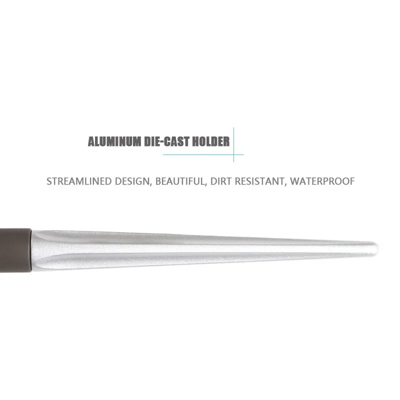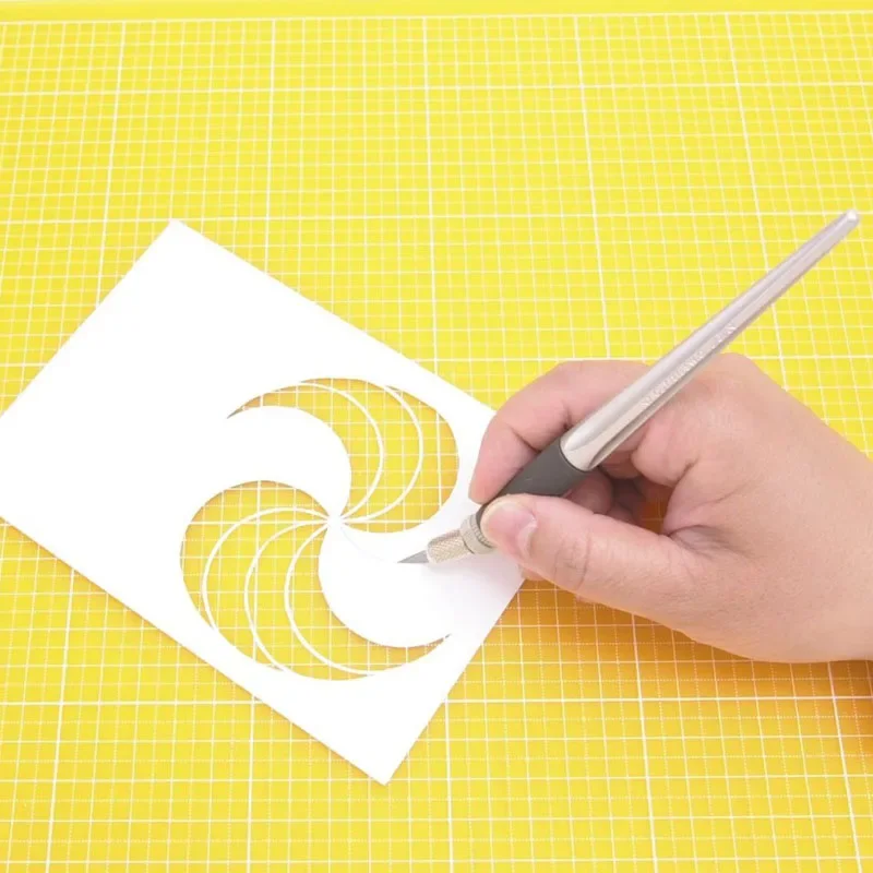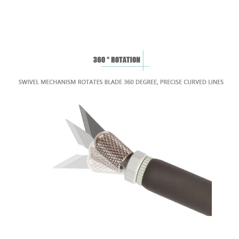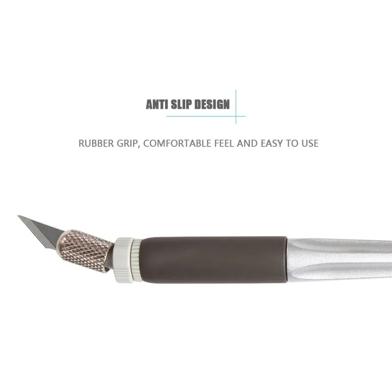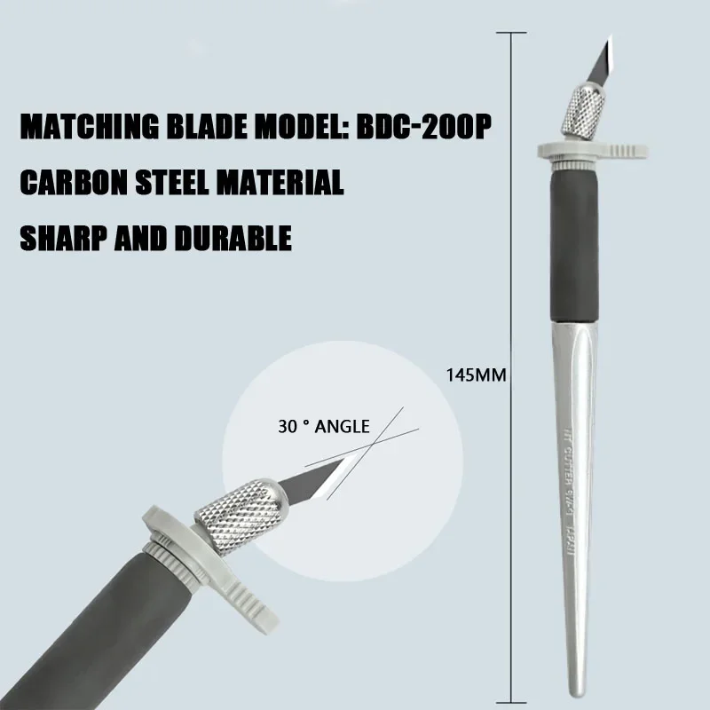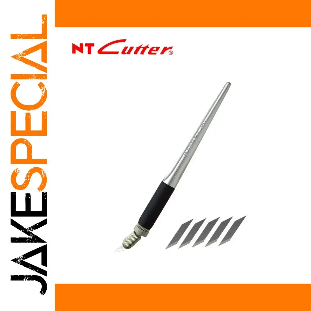 The NT Cutter SW-600GP Carving Set is designed for precision and comfort, featuring a sleek, metallic silver aluminum alloy holder with a textured rubber grip for ergonomic control. This cylindrical holder tapers to a sharp point and includes five spare triangular blades (model BDC-200P, 30 degrees) ideal for intricate detailing and curved lines. The 360-degree swivel mechanism allows for versatile blade rotation, making it perfect for a variety of artistic and woodworking applications. Crafted from high-quality metal components, this set promises durability, strength, and resistance to wear, ensuring reliable performance for both professionals and enthusiasts.