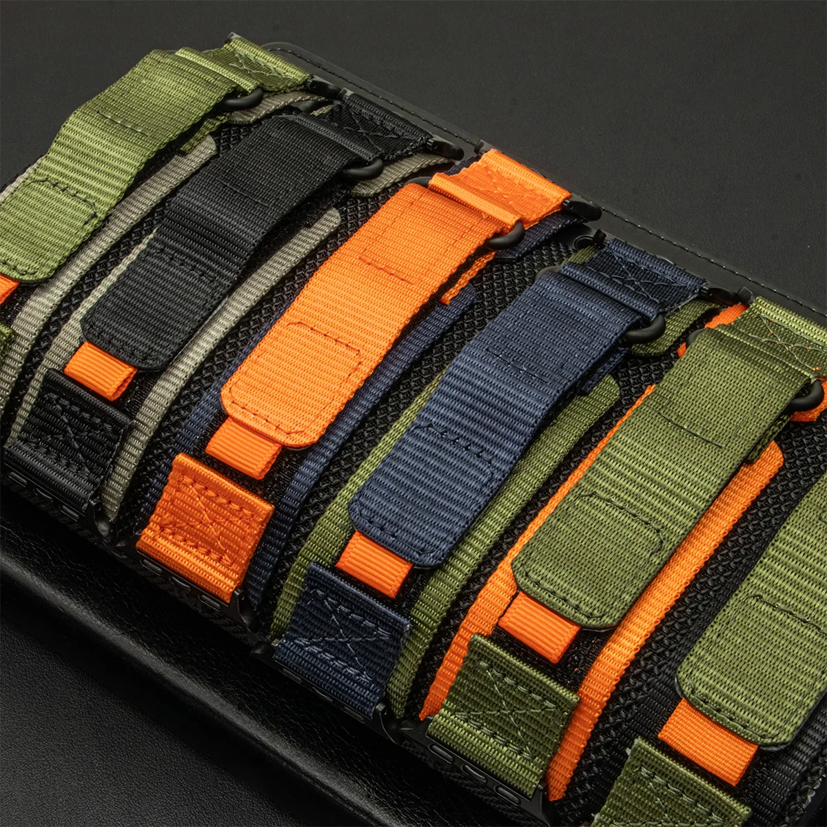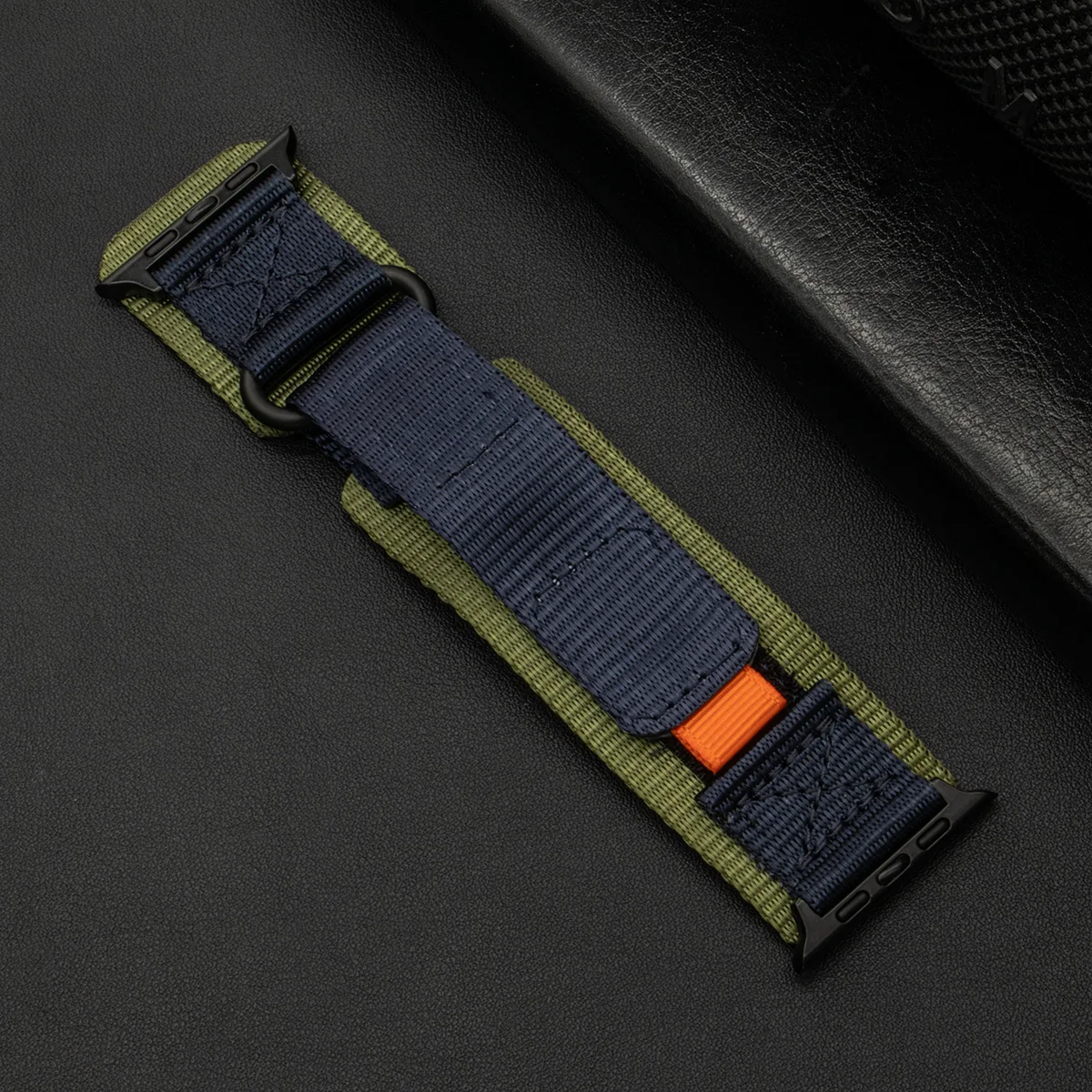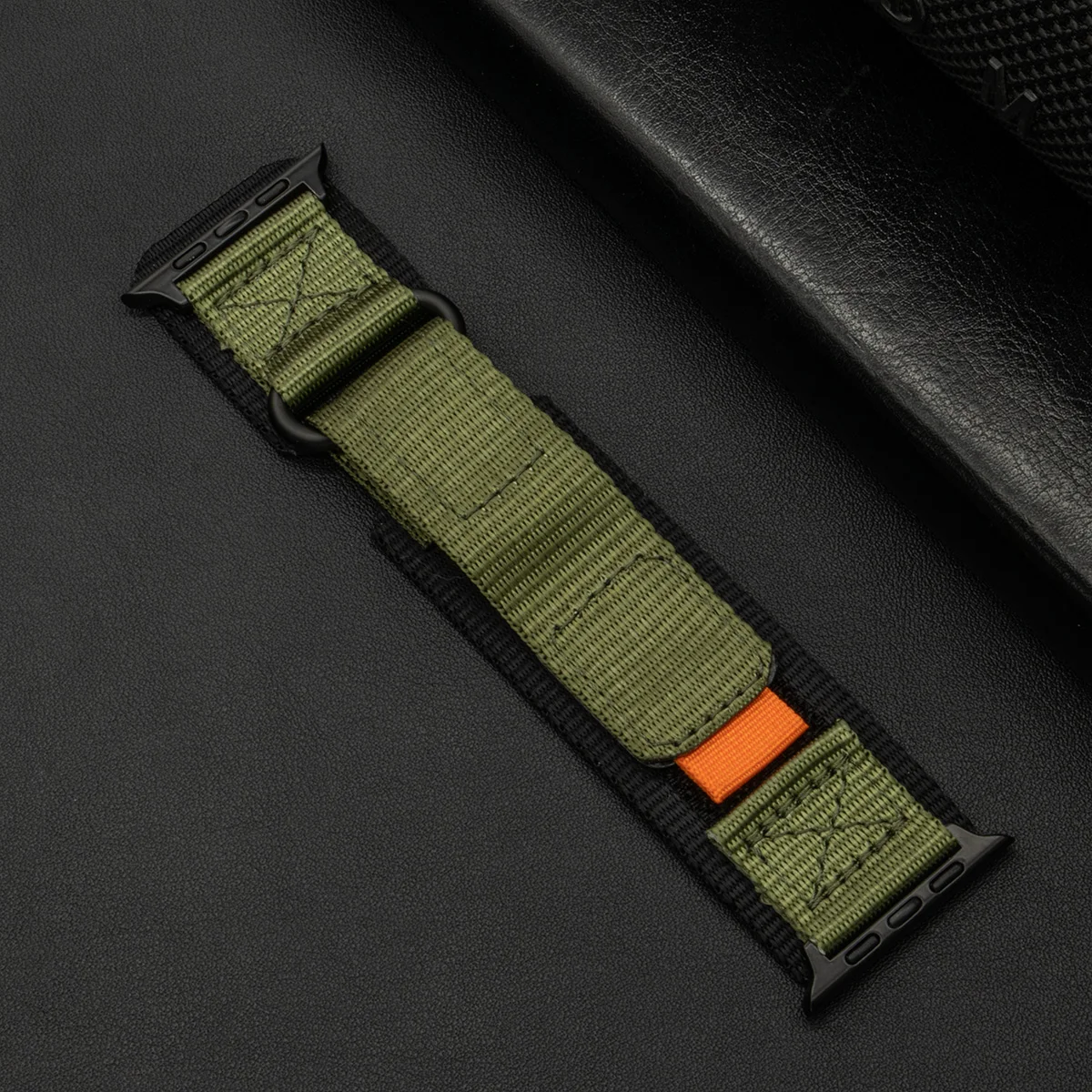 Experience a perfect blend of durability and style with this this nylon sport wristband designed specifically for Apple Watch models. Crafted from high-quality nylon, it offers a rugged yet comfortable fit for everyday wear and athletic activities. Available in vibrant orange, subdued olive green, sleek navy blue, and classic black, this strap complements your daily look while providing practicality with its adjustable black plastic buckle and eye-catching tabs. Its textured surface highlights fine stitching details, emphasizing its robust construction. Whether you're hitting the gym or running errands, this strap ensures your Apple Watch stays secure and stylish, enhancing your active lifestyle. Easy to install and remove, it’s a versatile choice for any occasion.