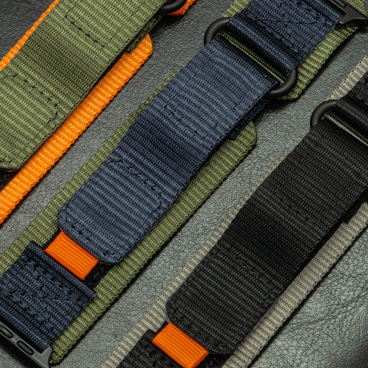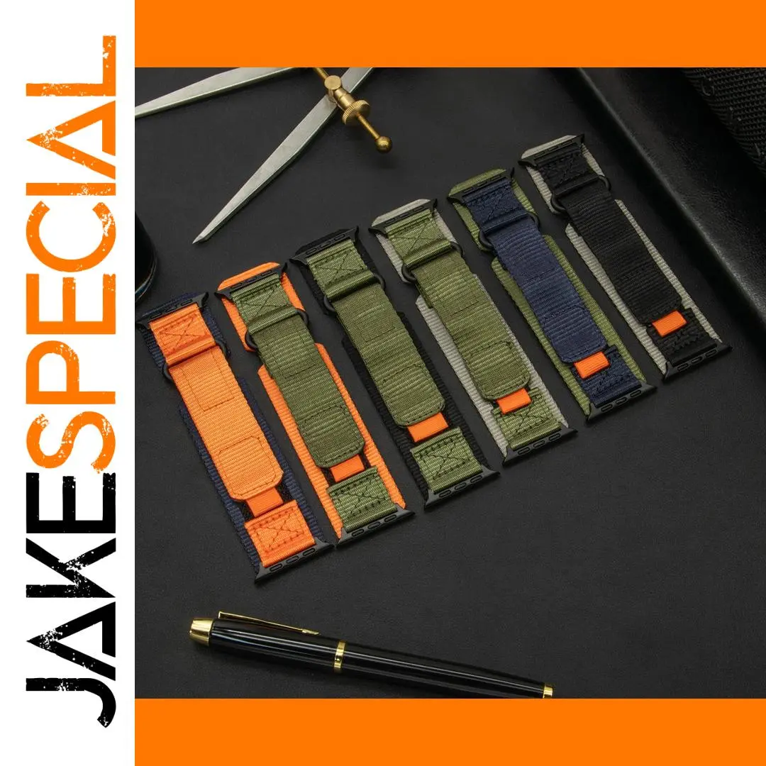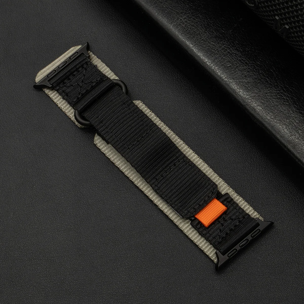 Experience a perfect blend of durability and style with this this nylon sport wristband designed specifically for Apple Watch models. Crafted from high-quality nylon, it offers a rugged yet comfortable fit for everyday wear and athletic activities. Available in vibrant orange, subdued olive green, sleek navy blue, and classic black, this strap complements your daily look while providing practicality with its adjustable black plastic buckle and eye-catching tabs. Its textured surface highlights fine stitching details, emphasizing its robust construction. Whether you're hitting the gym or running errands, this strap ensures your Apple Watch stays secure and stylish, enhancing your active lifestyle. Easy to install and remove, it’s a versatile choice for any occasion.
