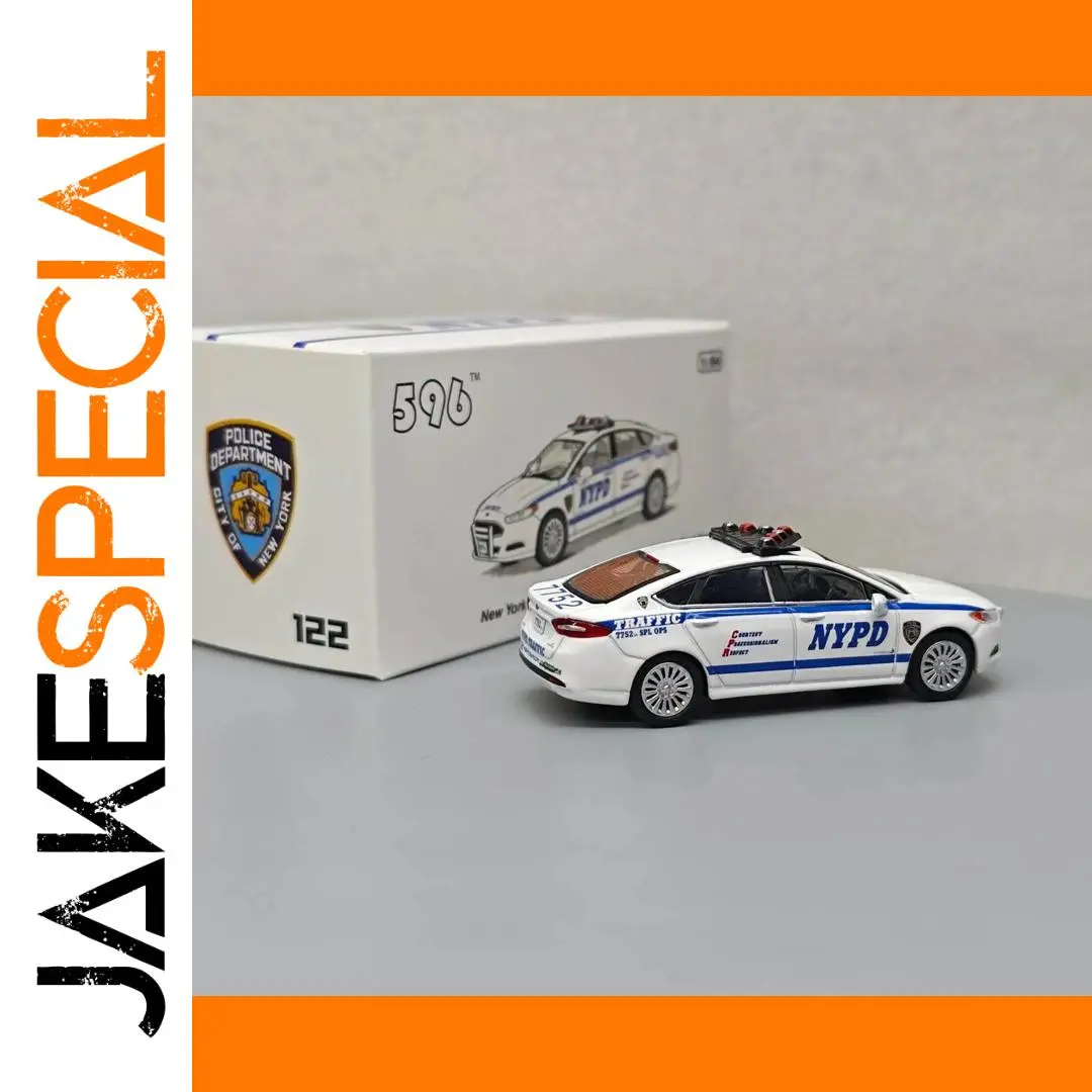 Step into the world of law enforcement with this detailed NYPD Mondeo TL diecast model, expertly crafted in a 1:64 scale. The vehicle boasts a pristine white finish accented by bold blue decals, including the iconic “NYPD” lettering on the doors, a shield badge, and other authentic markings like “Traffic” and “7752 SPL. OPS.” Its realistic design features sculpted lines, side mirrors, and door handles, making it a perfect collector's piece or display item. The roof is fitted with emergency lights in striking red and black, adding to its authenticity. With silver alloy rims and black tires, this model exudes professionalism and attention to detail, ideal for enthusiasts and collectors alike.