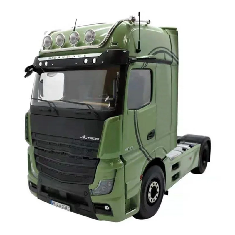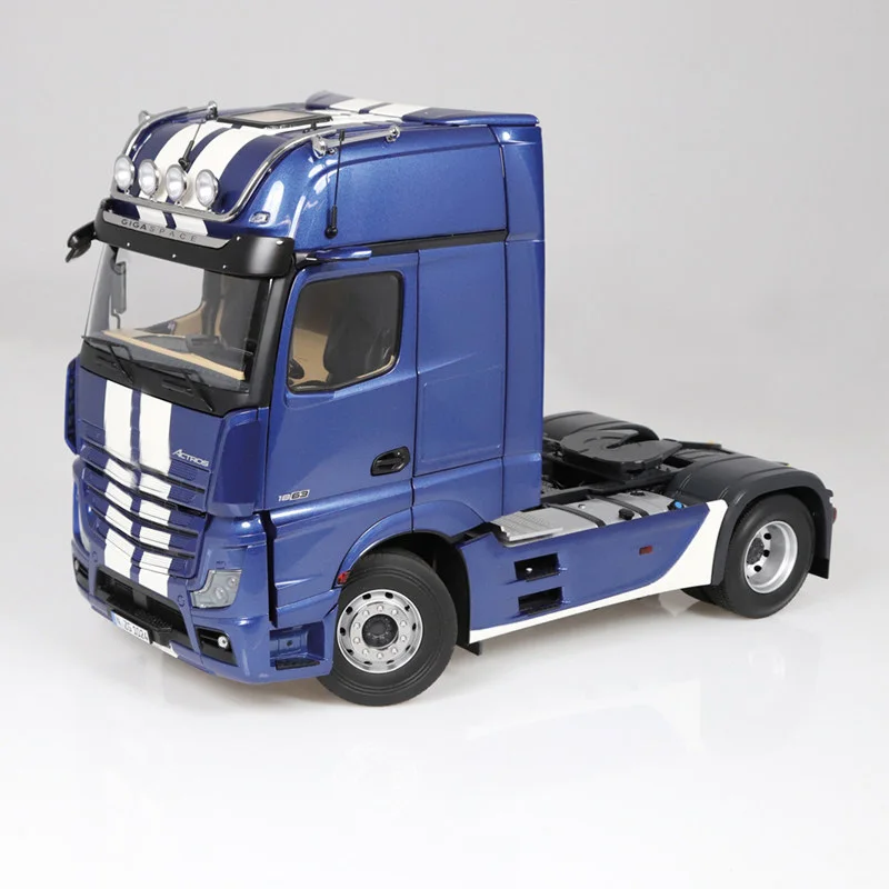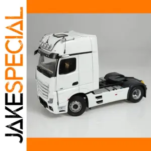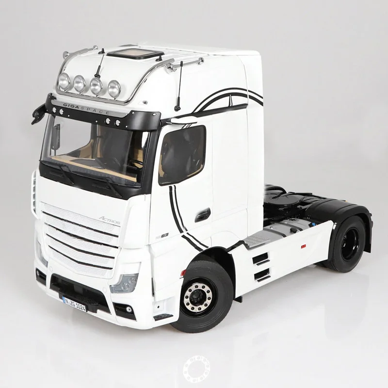 This meticulously crafted 1:18 scale alloy model of the Mercedes-Benz Actros Giga Space 4×2 truck tractor features a sleek, pristine white finish with optional accents in black, white watermark, black watermark logo, blue, and logo style. Designed as a highly detailed collectible, it showcases realistic features such as a detailed front grille with horizontal slats, integrated headlights, auxiliary lights, large curved windshield, optional roof-mounted lights and skylight, black trim accents, and textured tires with realistic hubcaps. Made from durable metal alloy, this finished model is perfect for adult collectors seeking a sophisticated display piece that captures the modern elegance and technical precision of the iconic truck.