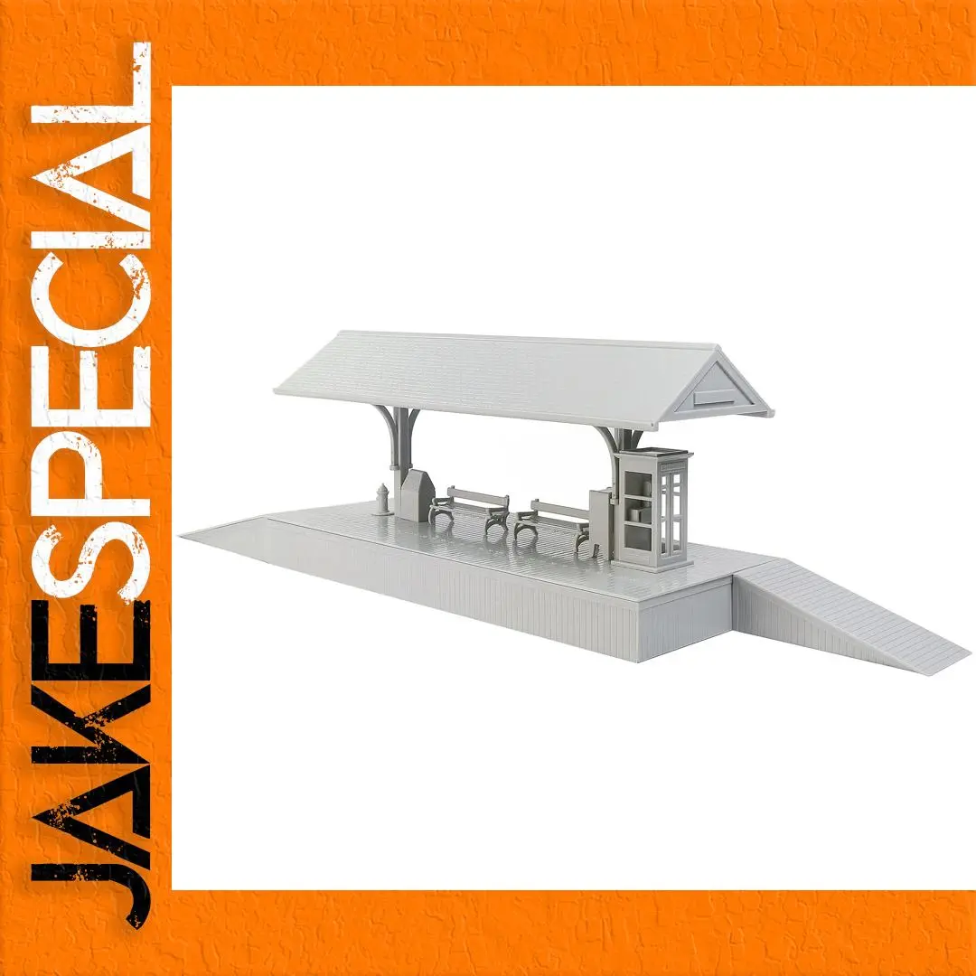 Transform your model railroad scene with this highly detailed, unpainted plastic station platform kit from Evemodel. Crafted at a 1:50 scale suitable for O Scale layouts, this kit includes a rectangular platform with textured surfaces mimicking wooden planks, offering a realistic base for your miniature railway environment. The assembly features a covered waiting area with a pitched roof, supported by sturdy vertical columns, and a detailed ticket booth with transparent windows. Small refined accessories such as ornate benches, a lamp post, and signage add to the authenticity of your scene. Its unpainted white plastic material allows you to personalize and paint it to match your specific design aesthetic, making it perfect for hobbyists who enjoy customizing their layouts.