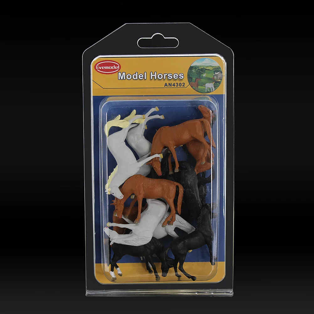 Transform your railway scenery with Evemodel's O Scale 1:43 PVC Model Horses. These beautifully crafted horses, available in sets of 12 or 24, bring life and authenticity to your model displays. Featuring three different poses in various colors—black, white, and brown—these figures are perfect for collectors and hobbyists alike. Picture the charming landscape as these detailed horses grace your layout, enhancing its visual appeal. Whether you're an avid model builder or just looking to elevate your collection, these model horses will surely impress.