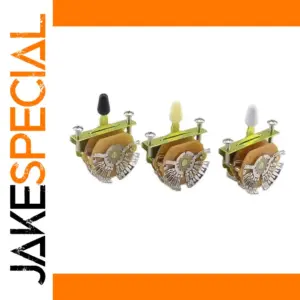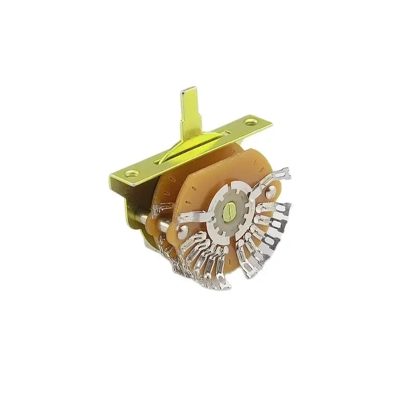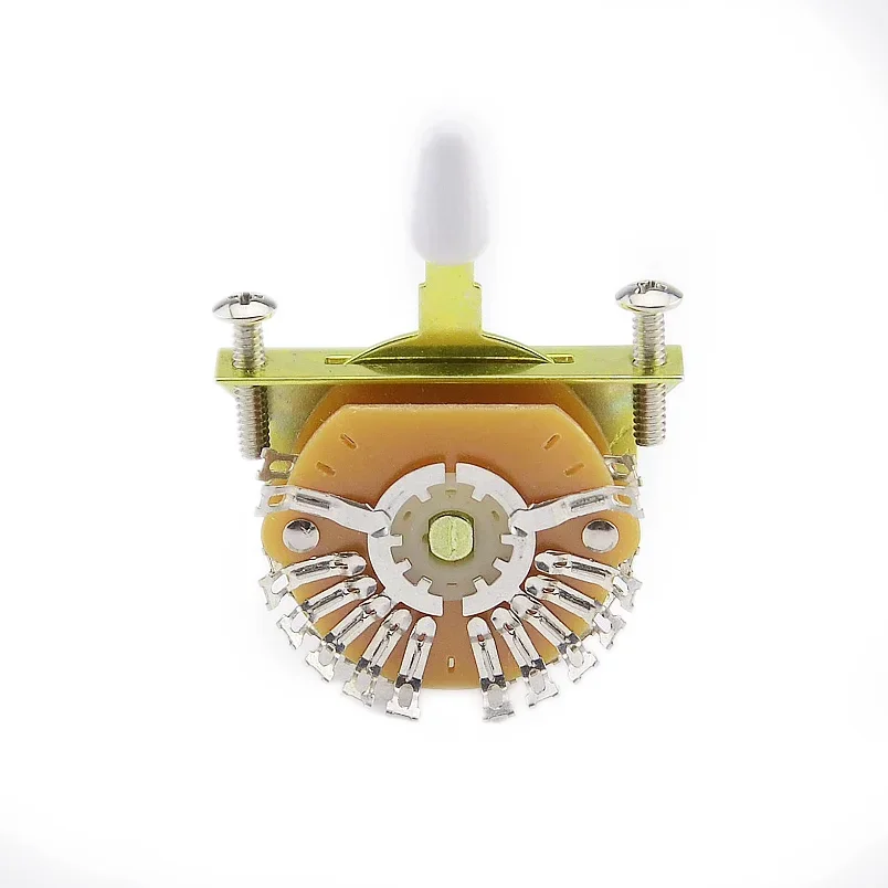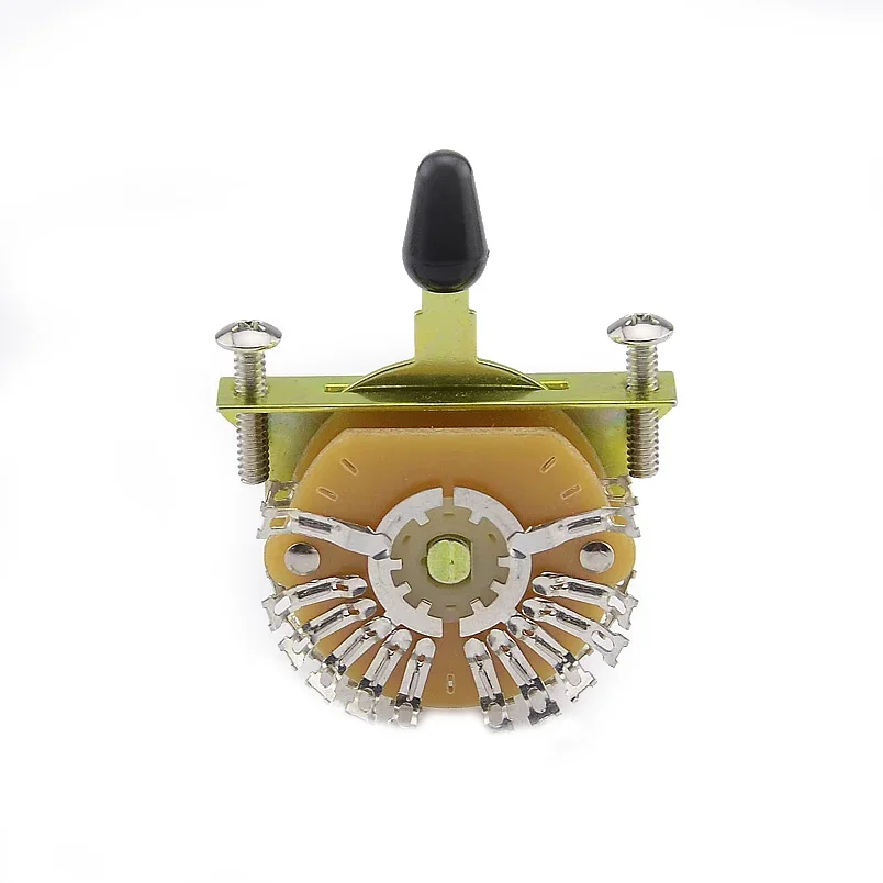 Enhance your electric guitar with this high-quality Oak Grigsby 4-pole double wafer 5-way super switch, model 0714. Crafted from durable metal and weighing only 30 grams, it offers reliable performance and a sleek, modern look. Available in three stylish options—black tip, white tip, or AW tip—each switch features a vibrant yellow circuit board with four mounting screws and a distinct plastic tip for easy toggling. The exposed semi-circular contact blades ensure precise switching between pickup configurations, making it an ideal upgrade for serious guitar enthusiasts seeking durability, style, and functionality.