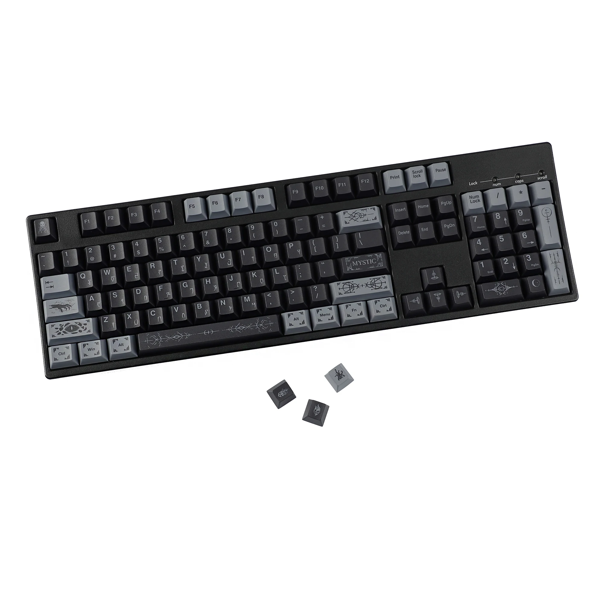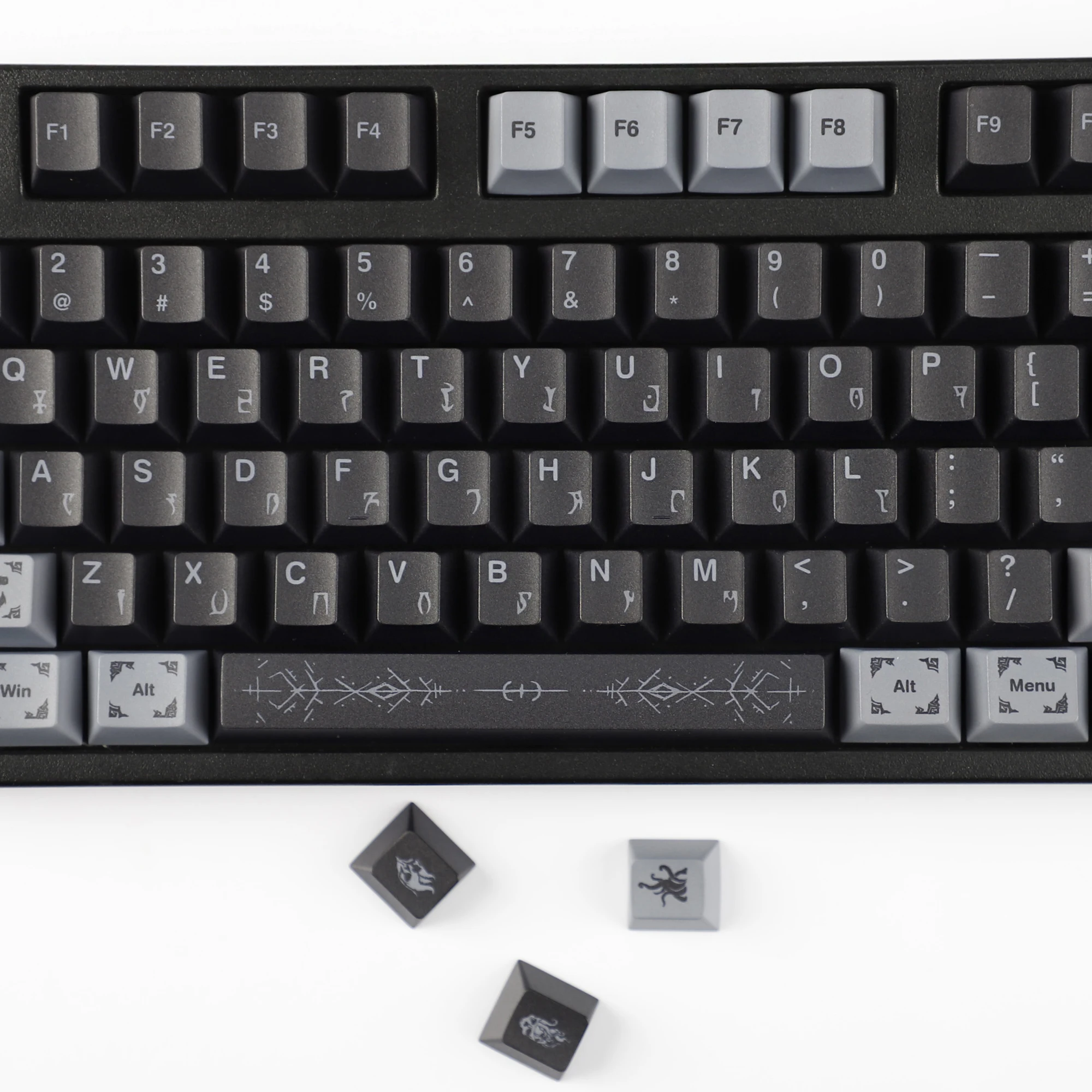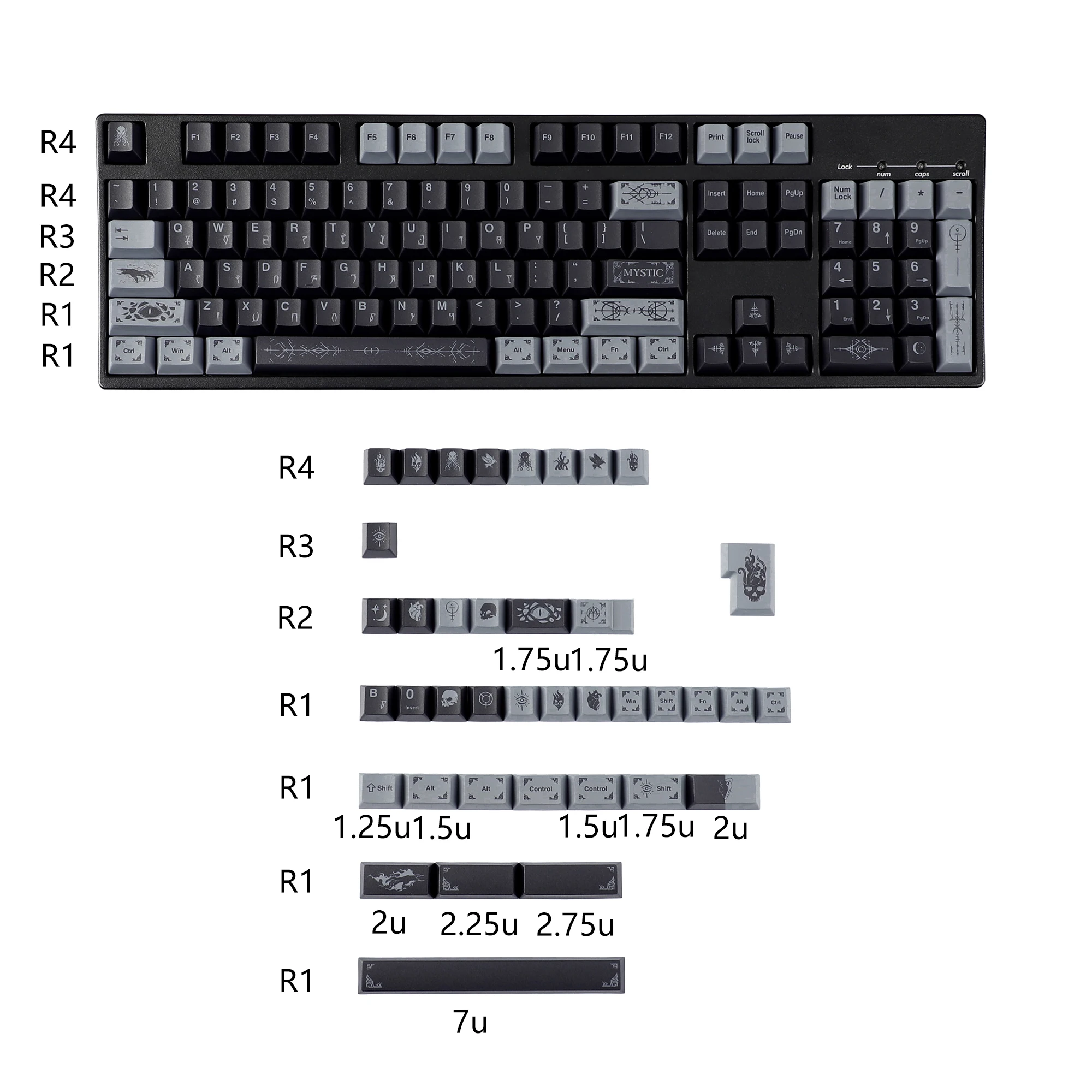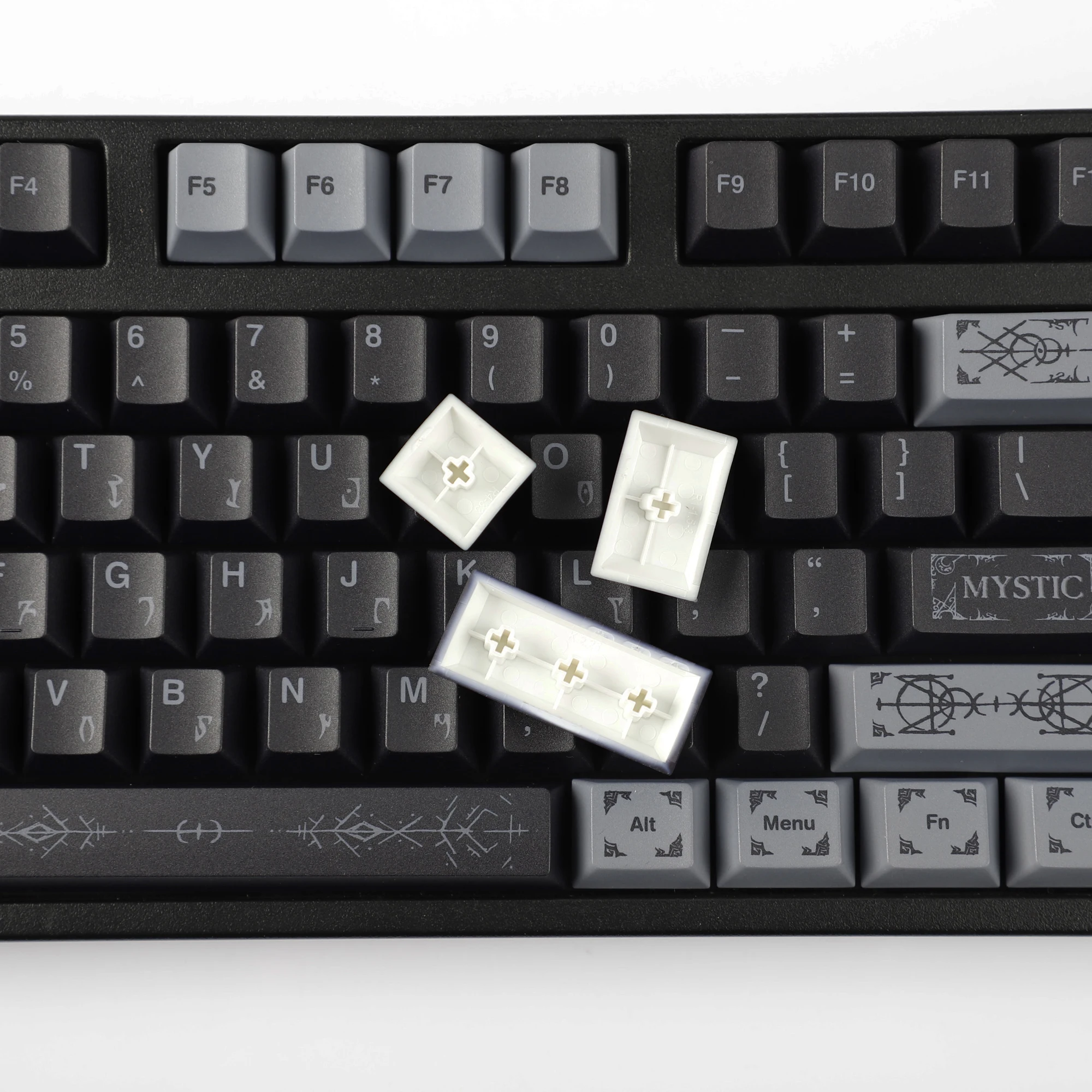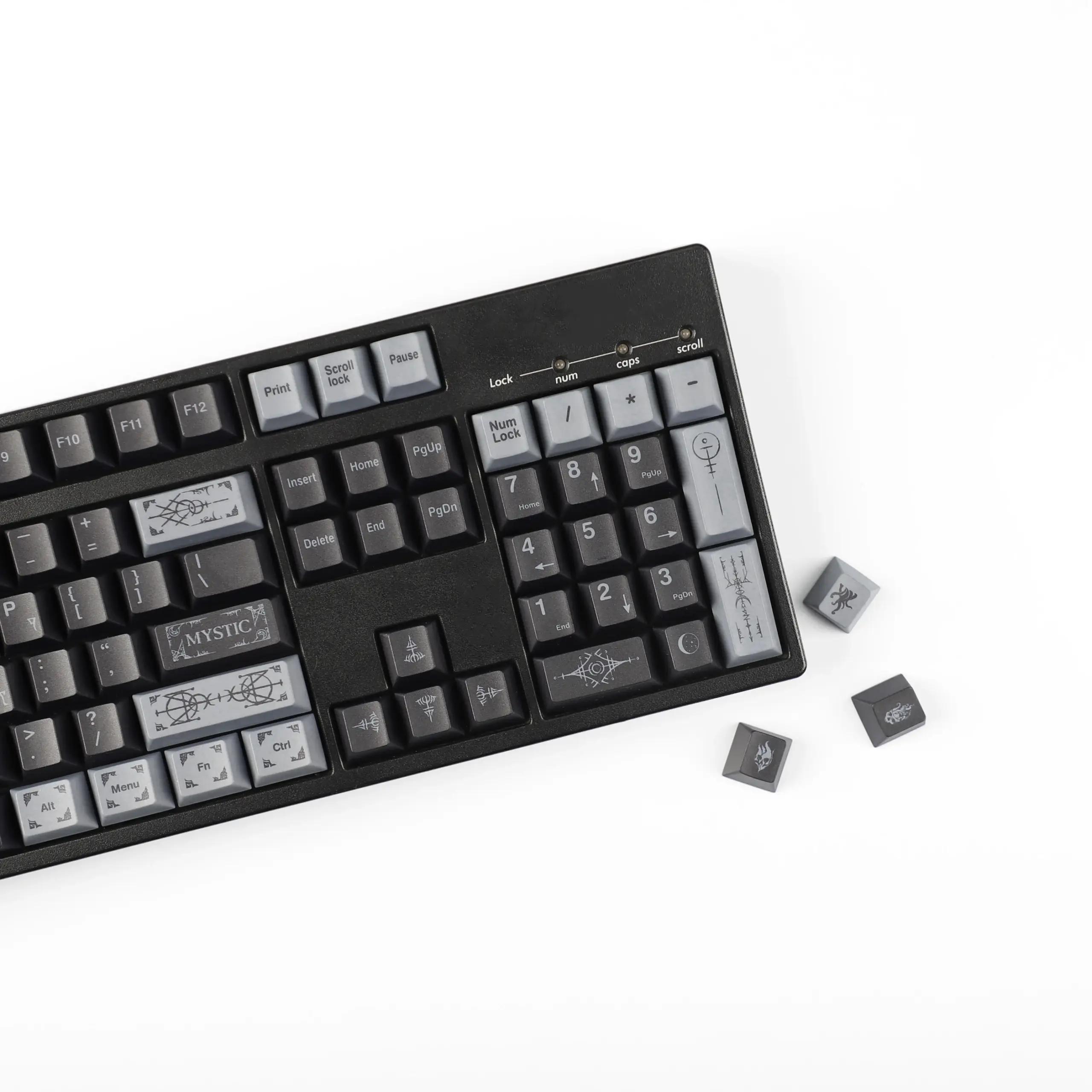 Experience a mystical upgrade for your mechanical keyboard with this exclusive occult-themed 143 keycap set. Crafted from durable PBT material with a matte finish, these keycaps feature a sleek black base with light gray accents, creating a striking contrast. The cherry profile ensures quick, comfortable keystrokes, perfect for gaming or typing. Unique decorative symbols like dragons and snowflakes add a mystical vibe, bringing personality and style to your setup. Each keycap's design is enhanced with dye-sublimation printing, ensuring legends never fade through prolonged use. Whether customizing your existing MX mechanical keyboard or building a new one, this set delivers both aesthetics and performance in one package.