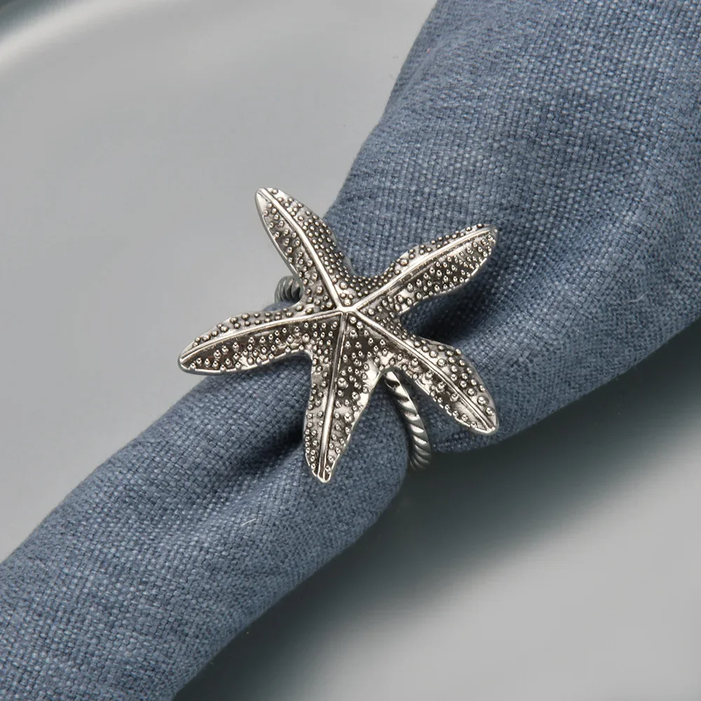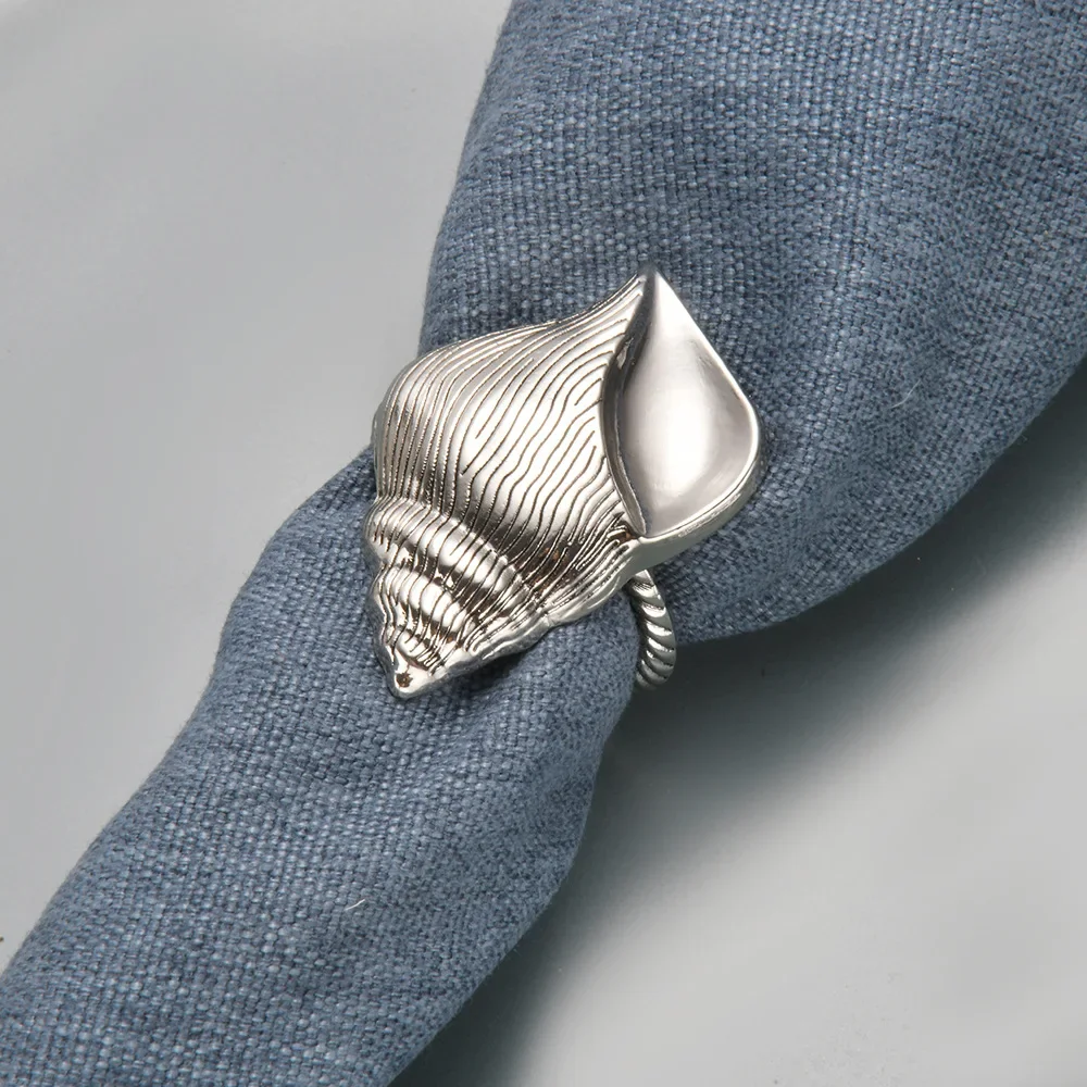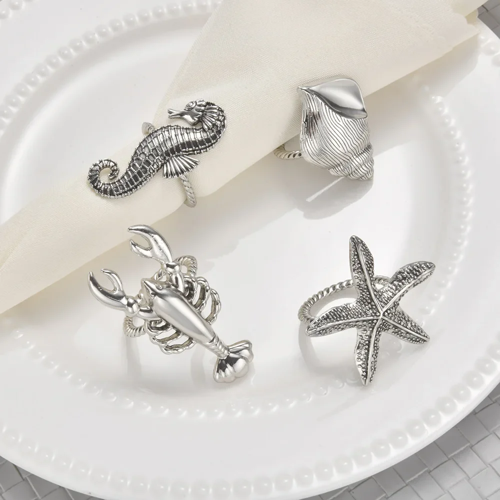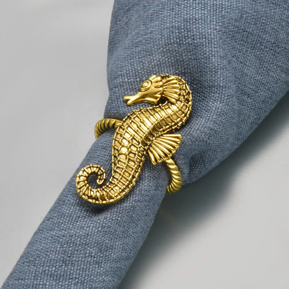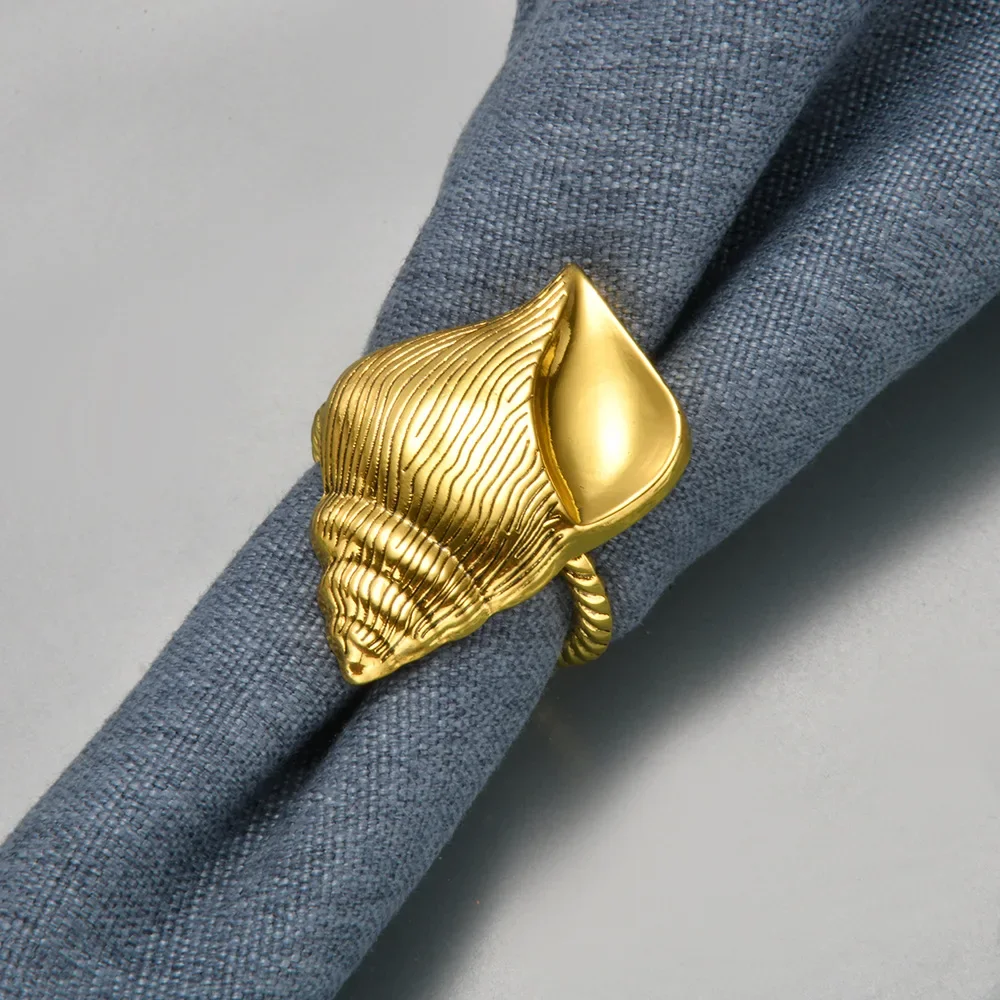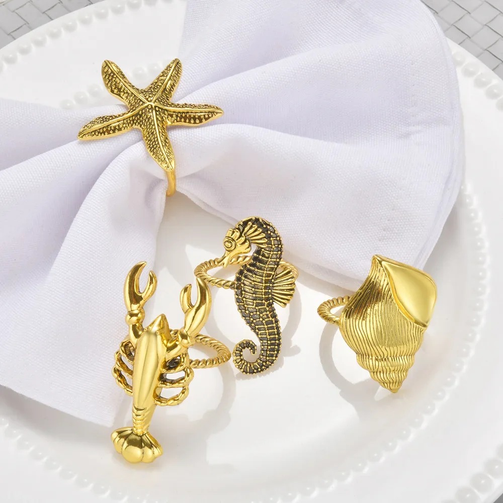 Enhance your table setting with this elegant stainless steel napkin ring featuring a zinc alloy construction and a lustrous gold finish. Designed to fit all cloth napkins measuring approximately 1-3 cm, it offers sturdy, mid-weight durability ideal for weddings, banquets, parties, and celebrations. Available in a variety of charming ocean-inspired designs including conch, shrimp, starfish, and Hippocampus, in both gold and silver tones, each piece adds a touch of coastal sophistication. Perfect as a decorative accent, these eco-friendly napkin rings bring a refined seaside charm to any event while keeping napkins neatly rolled and accessible for your guests.