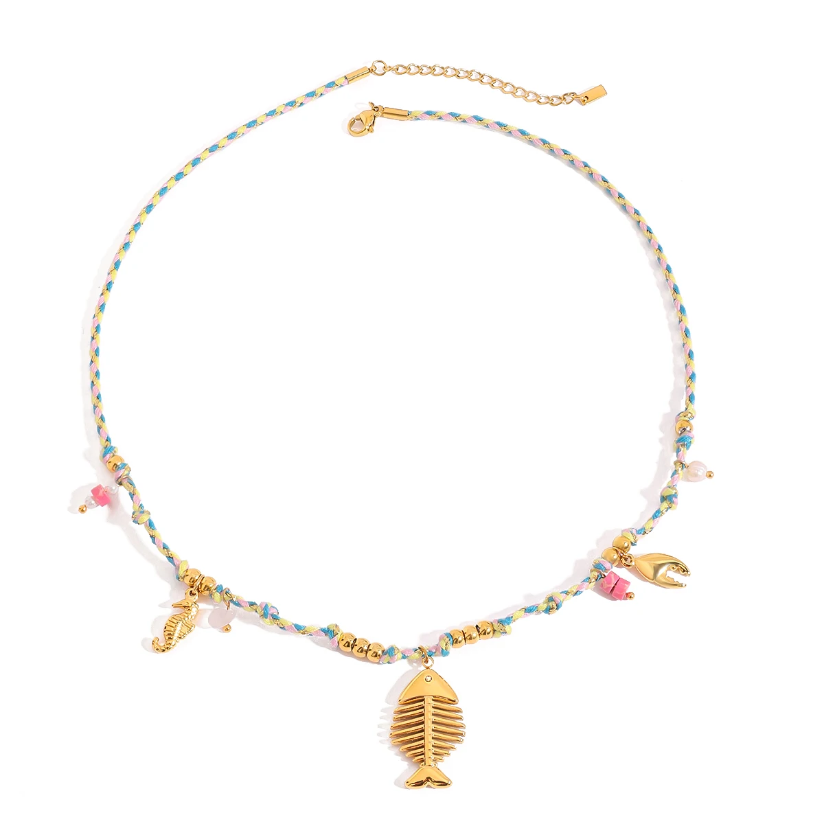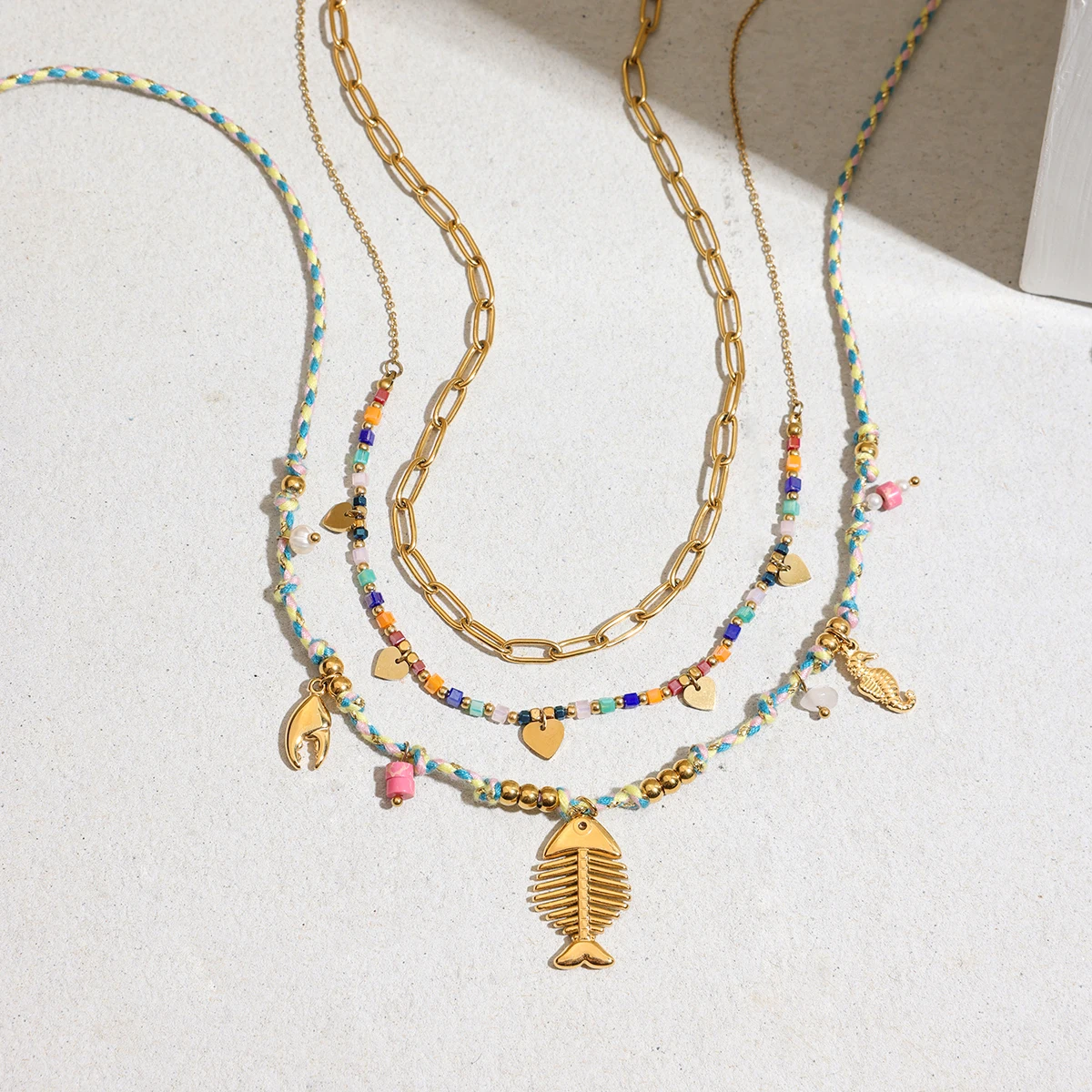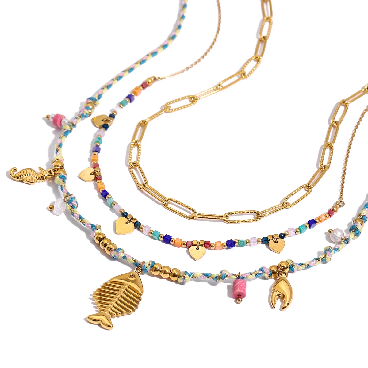 Elevate your jewelry collection with this stunning ocean-inspired gold necklace designed for women. Crafted from durable stainless steel with a high-quality, chemical-free finish, it offers both luxury and everyday wearability. The layered design features a bold, shiny gold chunky chain, delicate beaded chains with colorful oceanic accents, and a charming gold fish pendant. Perfect for parties or casual outings, this trendy piece captures the vibrant seaside spirit with natural stone crab claws and a detailed seahorse charm. Its versatile rope chain style complements all outfits, making it an essential addition for lovers of nautical fashion. Feel confident and beautiful wearing this eye-catching, high-quality necklace that beautifully combines elegance with playful boho-chic vibes.