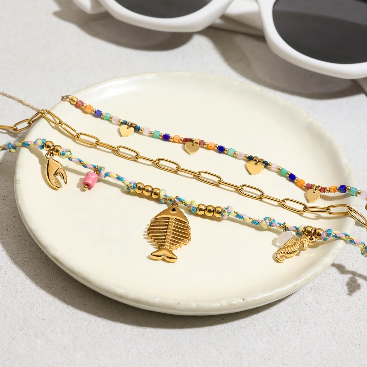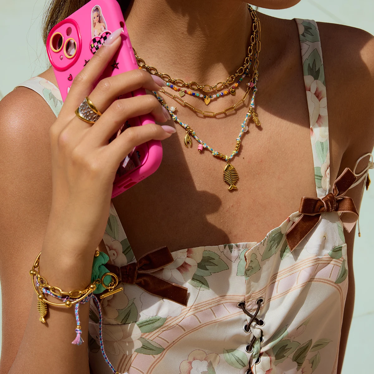 - Features a multi-layered design including a chunky chain, miniature beaded chains, and a gold fish pendant for versatile styling.