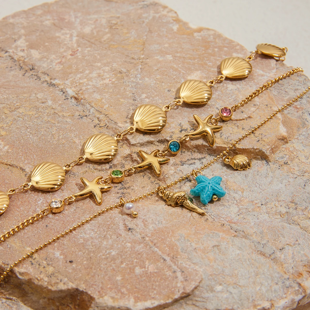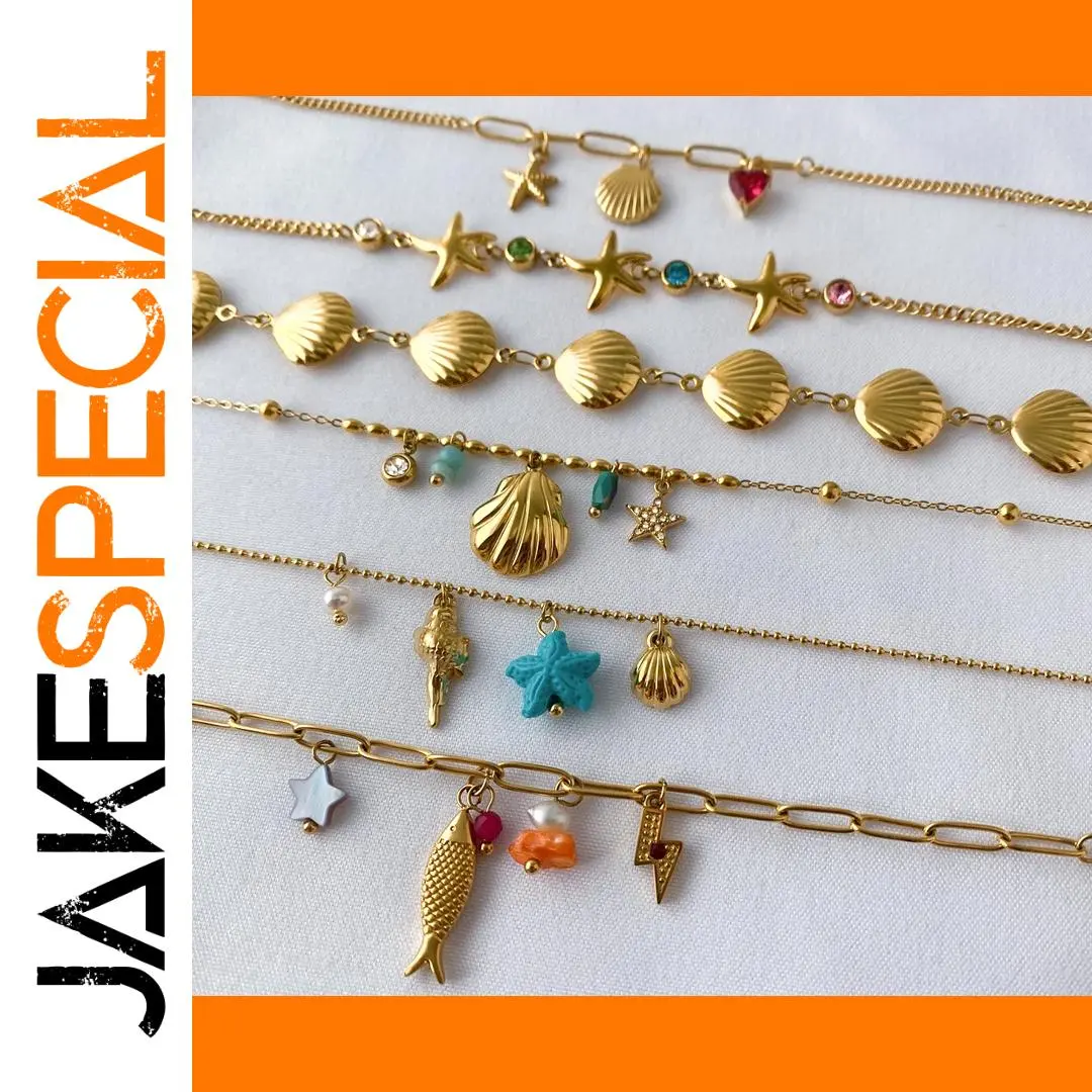 Enhance your beach-inspired style with this trendy ocean-themed gold-colored stainless steel bracelet, model number JDB0202011. Crafted from durable stainless steel, it features a ribbed ceramic conch shell pendant and a classic link chain design secured with a lobster-claw clasp. Perfect for women, this fashion-forward accessory exudes a playful maritime vibe with vibrant ocean motifs, including starfish, seashells, and coral accents. Its elegant yet bold style combines shimmering gold tones with intricate detailing, making it an ideal addition to your collection for a sophisticated, seaside-inspired look. Dive into your everyday elegance with this versatile bracelet.