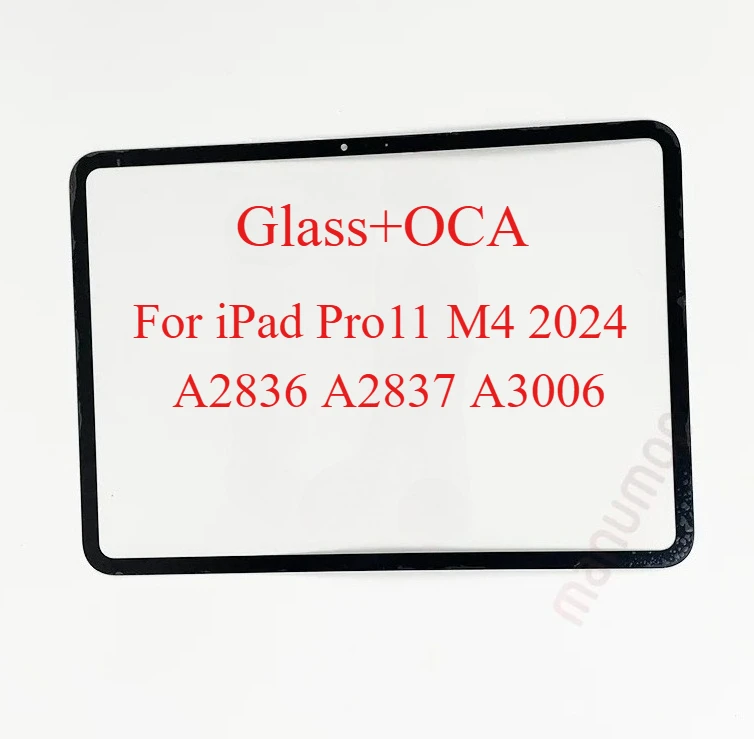 Upgrade your device with this OEM front screen outer glass designed specifically for the iPad Pro 11 M4 2024, compatible with models A2836, A2837, and A3006. Crafted from durable tempered glass, it features a glossy, smooth finish and a precise black frame with a small circular cutout for the front camera. The package includes an OCA frame sticker for effortless installation and reliable repair. Manufactured by Manumoc, this high-quality replacement part offers a seamless fit, clear reflection, and professional look, ensuring your tablet maintains a sleek, modern aesthetic while providing essential protection for your screen.
