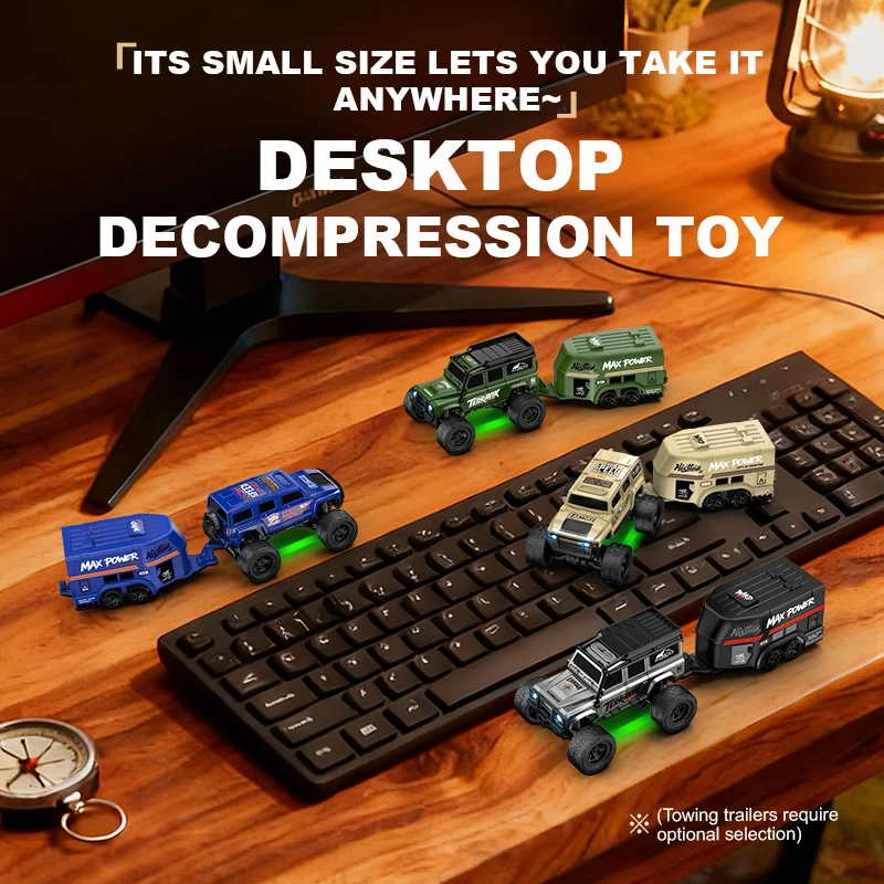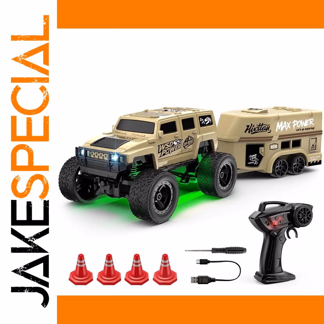 Experience the thrill of off-road adventure with this highly detailed remote control vehicle by LKCOMO. Designed for durability and excitement, this 1:64 scale toy features a rugged construction inspired by large off-road trucks. Its realistic beige body is accentuated with outdoor-themed decals such as “WSD POWER” and “MAX POWER,” complemented by detailed grille and vented hood elements. The vehicle's oversized black tires with deep treads ensure excellent grip for off-road crawling. Bright green suspension components add a bold contrast, emphasizing its sporty and sturdy aesthetic. With LED lights that illuminate during play, this model offers both visual realism and entertainment. Perfect for enthusiasts, this ready-to-go set captures adventure and durability in every detail.