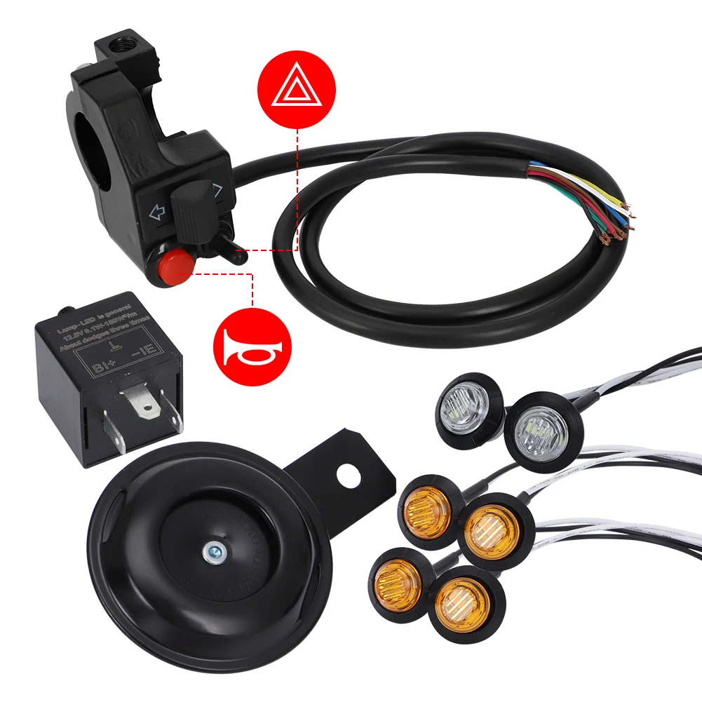 Transform your vehicle's safety and style with this comprehensive ATV, UTV, and quad LED light and horn kit. Designed for durability and ease of installation, it features sleek black housing components with vibrant amber and clear LED lights, creating a bold, rugged aesthetic. The compact round turn signals are mounted on black bases, offering excellent visibility from all angles. The handlebar switch sports a striking black housing with a prominent red button and icons, providing intuitive control over turn signals, horn, and safety functions. The included horn is sturdy and black, mounted on a durable bracket, completing the tough, off-road-ready look. With this kit, you’ll enjoy enhanced safety, style, and functionality for your vehicle setup.