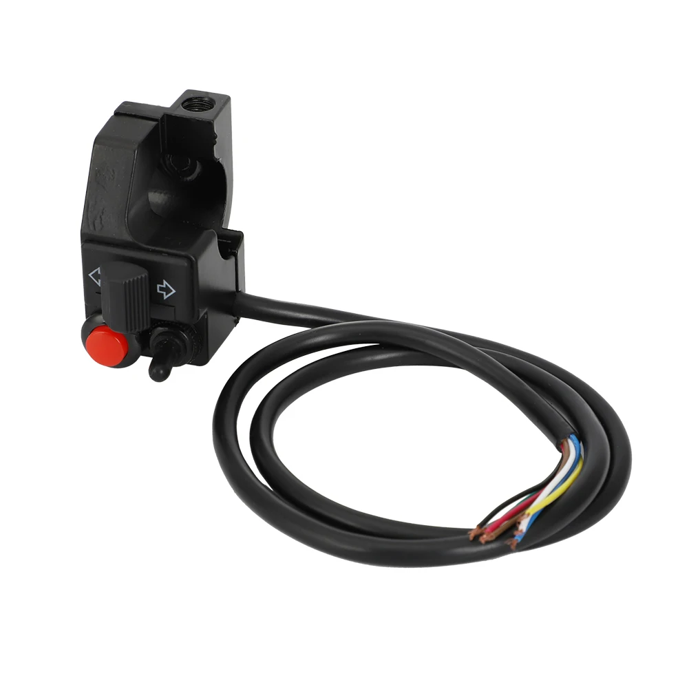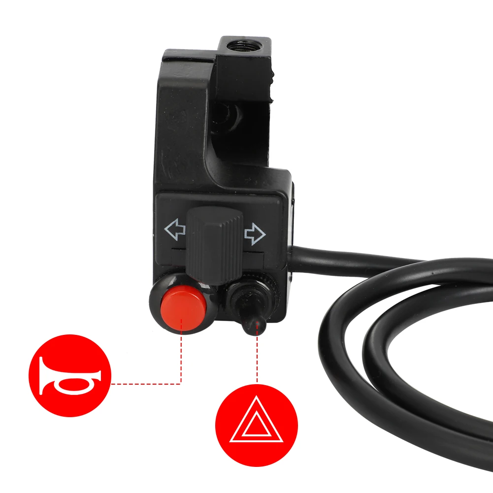 - Handlebar switch with a 7/8″ diameter black housing, red push button, and icons, supporting up to 4W and supporting 4-way hazard flash mode for increased safety.