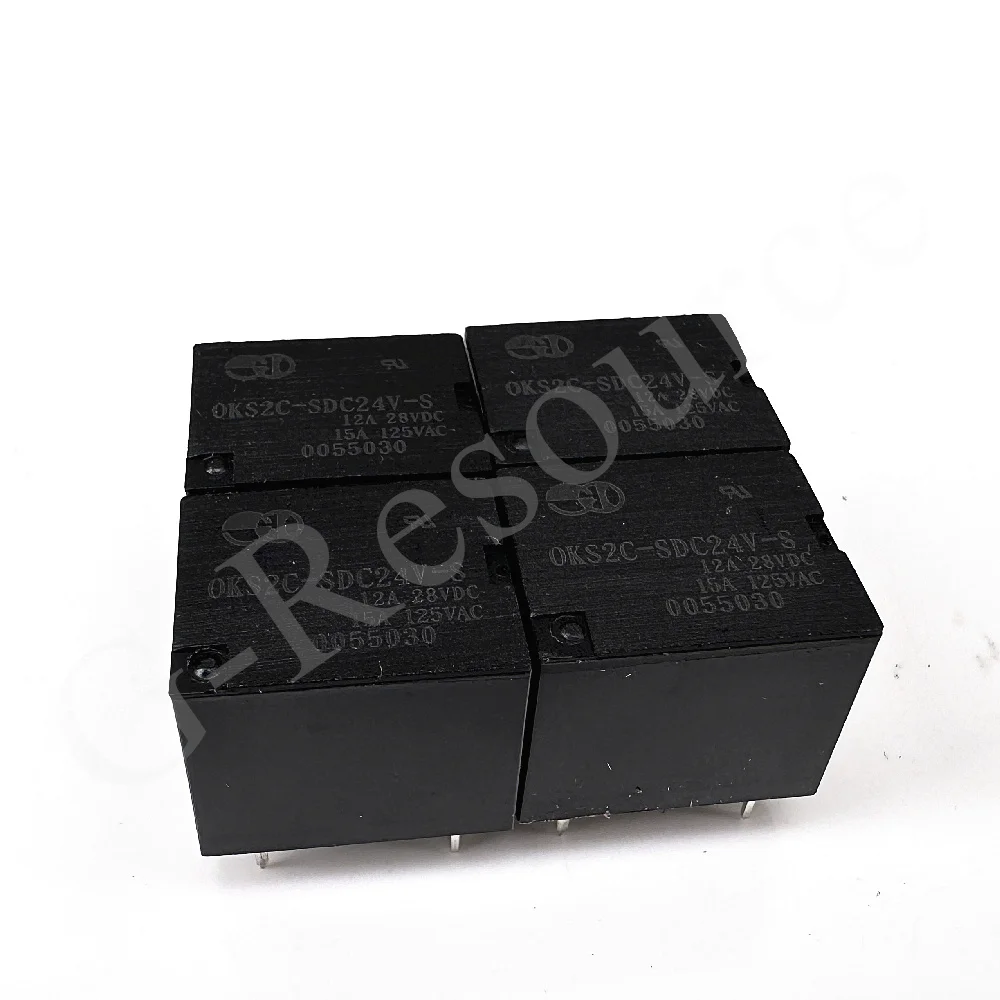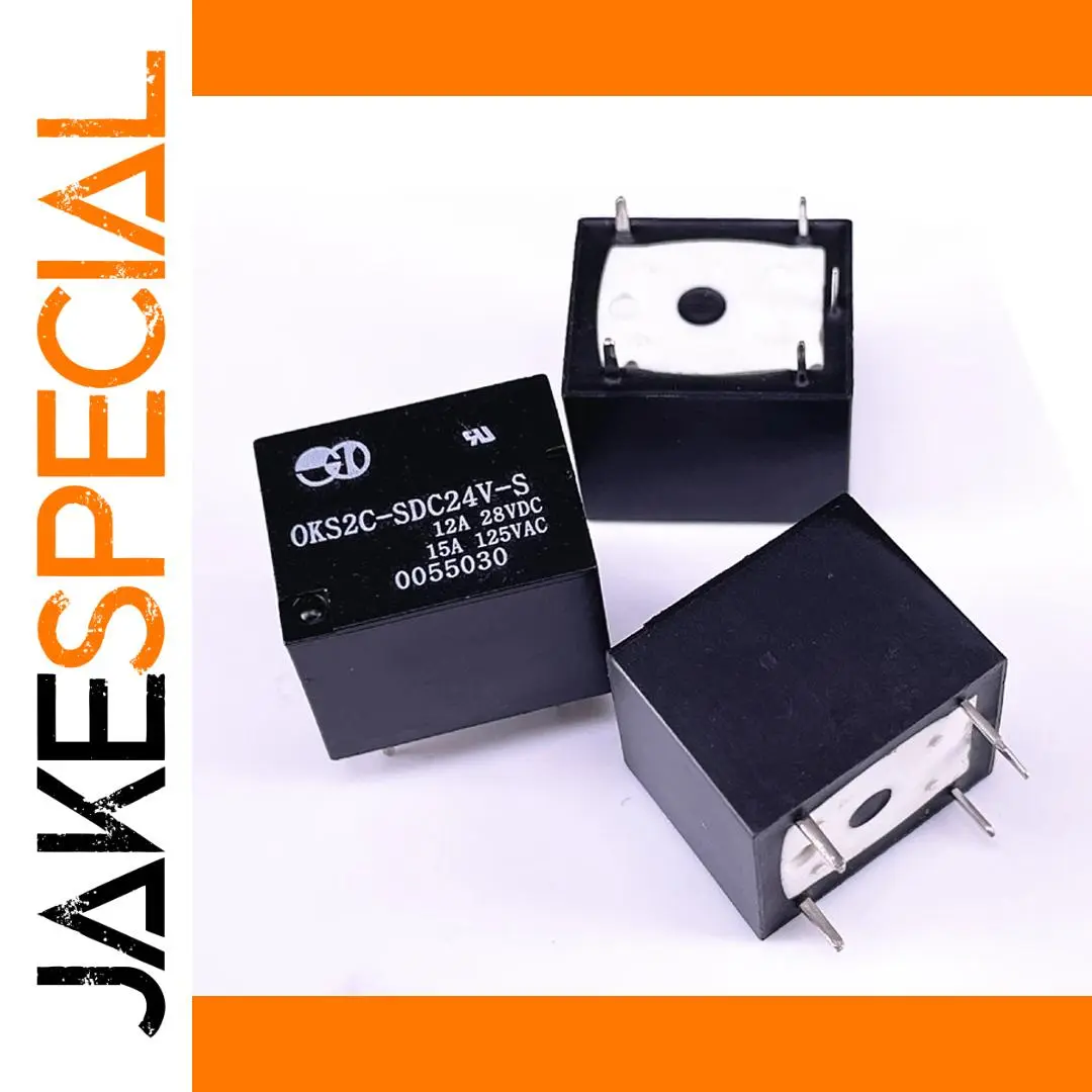 Experience reliable switching with this set of five new OKS2C-SDC24V-S relays, each operating at 24V with a 15A current rating. Designed in a DIP package for easy installation on circuit boards, these 5-pin relays feature a sleek black plastic exterior with a white top surface and rounded edges, combining durability with a professional appearance. The metallic pins ensure precise insertion and connection, ideal for high-current switching and electronic control systems. Certified for safety standards, these relays are suitable for semi-automatic control applications, providing robust performance and dependable operation in various industrial and electronic projects.