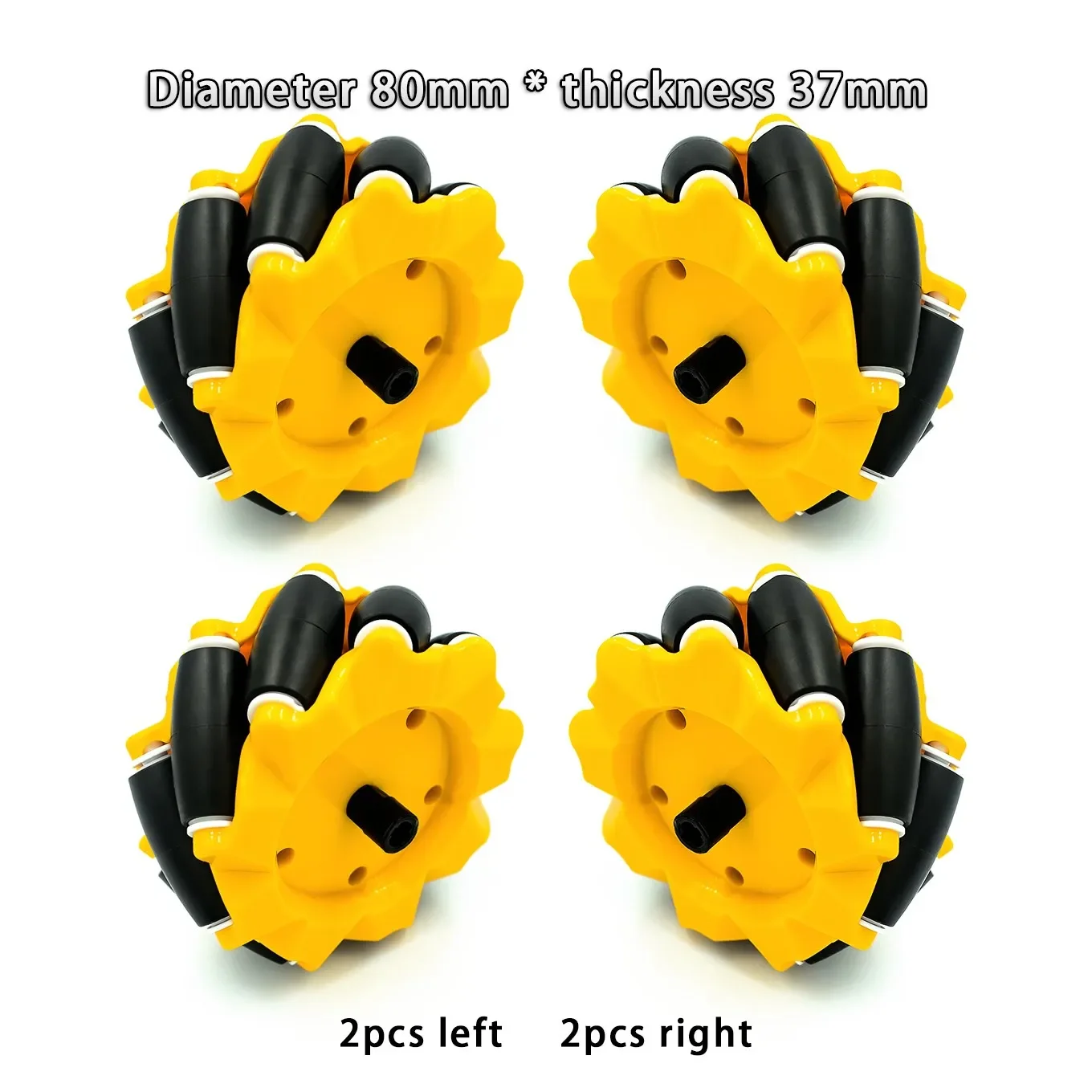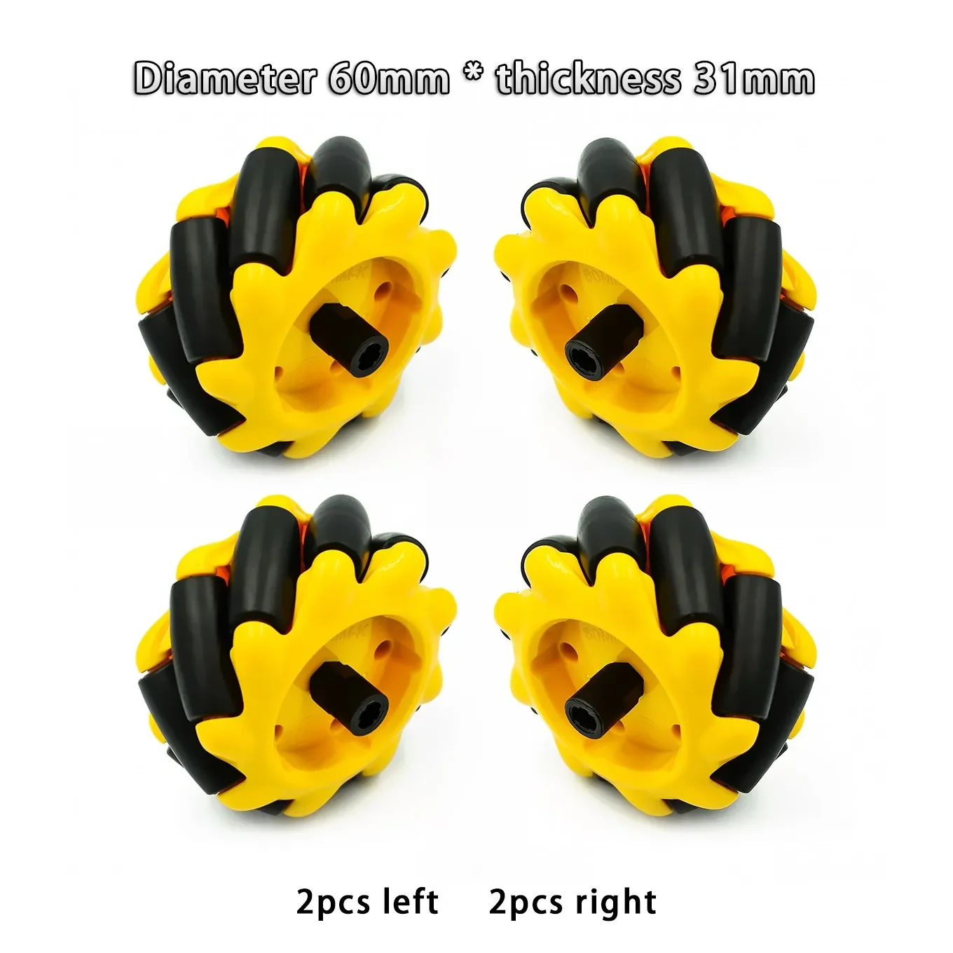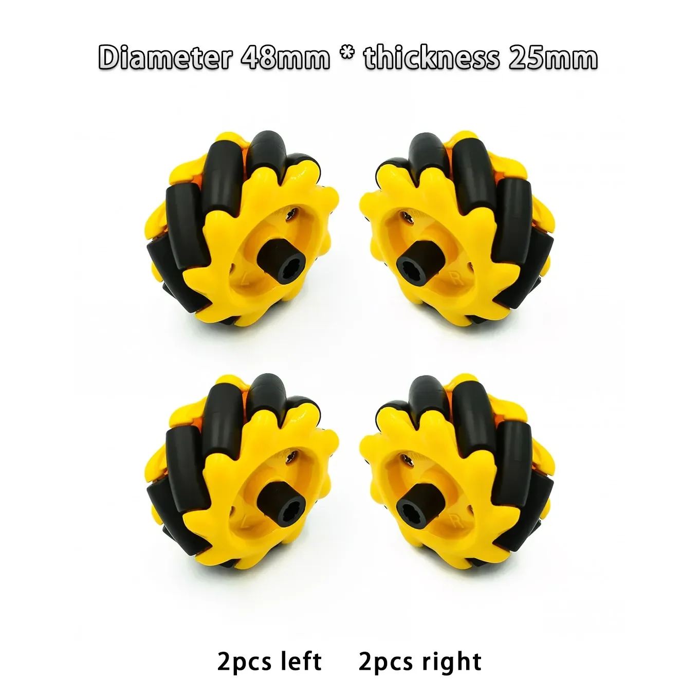 Enhance your robotics and smart car projects with this versatile set of four omnidirectional wheels, available in 48mm, 60mm, 80mm, and 97mm diameters, all made from high-hardness plastic for durability. Each wheel features a distinctive yellow hub with an interconnected, geometric spoke design and robust black rubber tires for high traction. Compatible with TT motors and equipped with 6mm bushings, these wheels ensure smooth, multidirectional movement across various surfaces. Their sleek, vibrant appearance combines technical sophistication with functionality, making them ideal for developers seeking reliable, high-quality components to elevate their robotic or mobile vehicle designs.