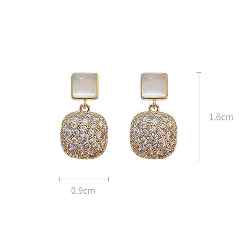 - Features a geometric shape design with a matte white, pearl-like top outline by a slim gold-tone frame, complemented by a glittering multicolored opal teardrop pendant.