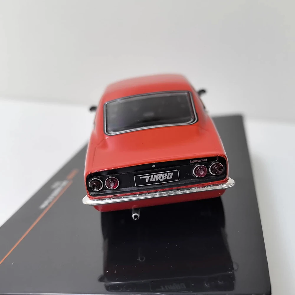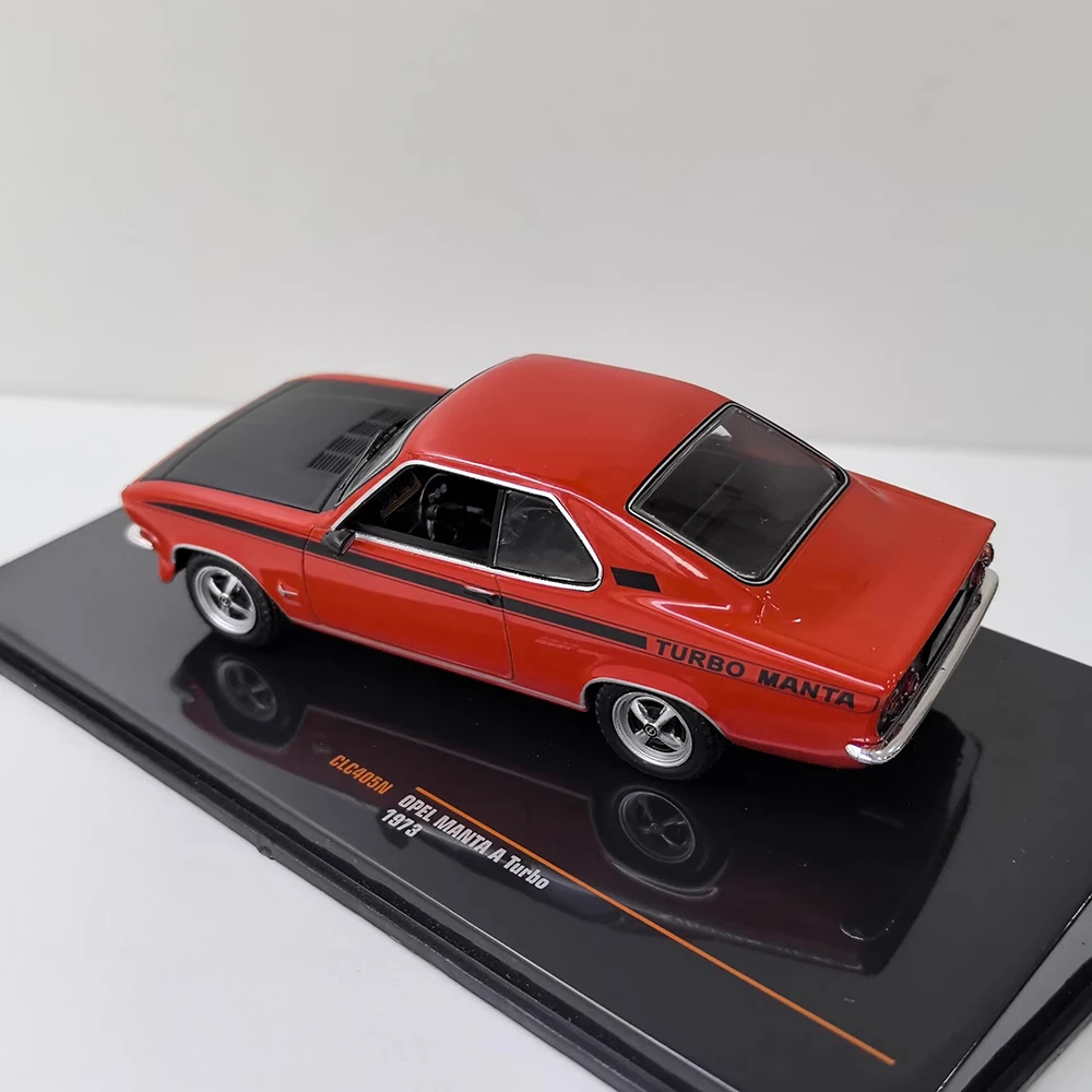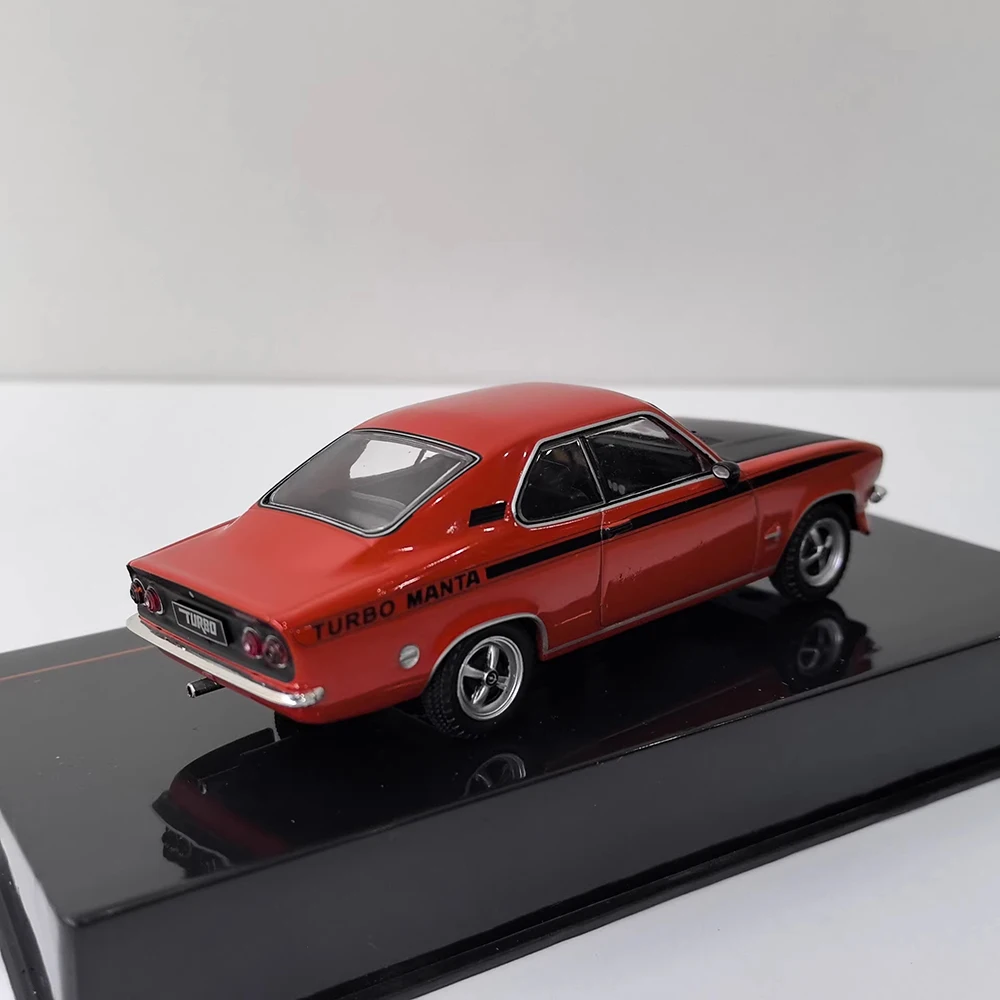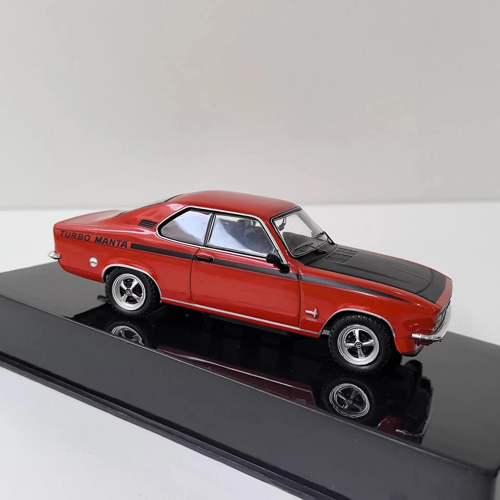 This meticulously crafted 1:43 scale die-cast replica of the Opel Manta A Turbo 1973 features a striking red body with a contrasting black hood, detailed sculpted lines, and realistic proportions. Made from alloy, rubber, and ABS, it showcases authentic design elements such as a detailed grille, dual round headlights with clear lenses, a black side stripe, and a finely rendered interior visible through transparent windows. The model measures approximately to the specified scale and is mounted on a black display base. As a static collectible, it is ideal for hobbyists, decorators, and enthusiasts who appreciate vintage sports car craftsmanship.